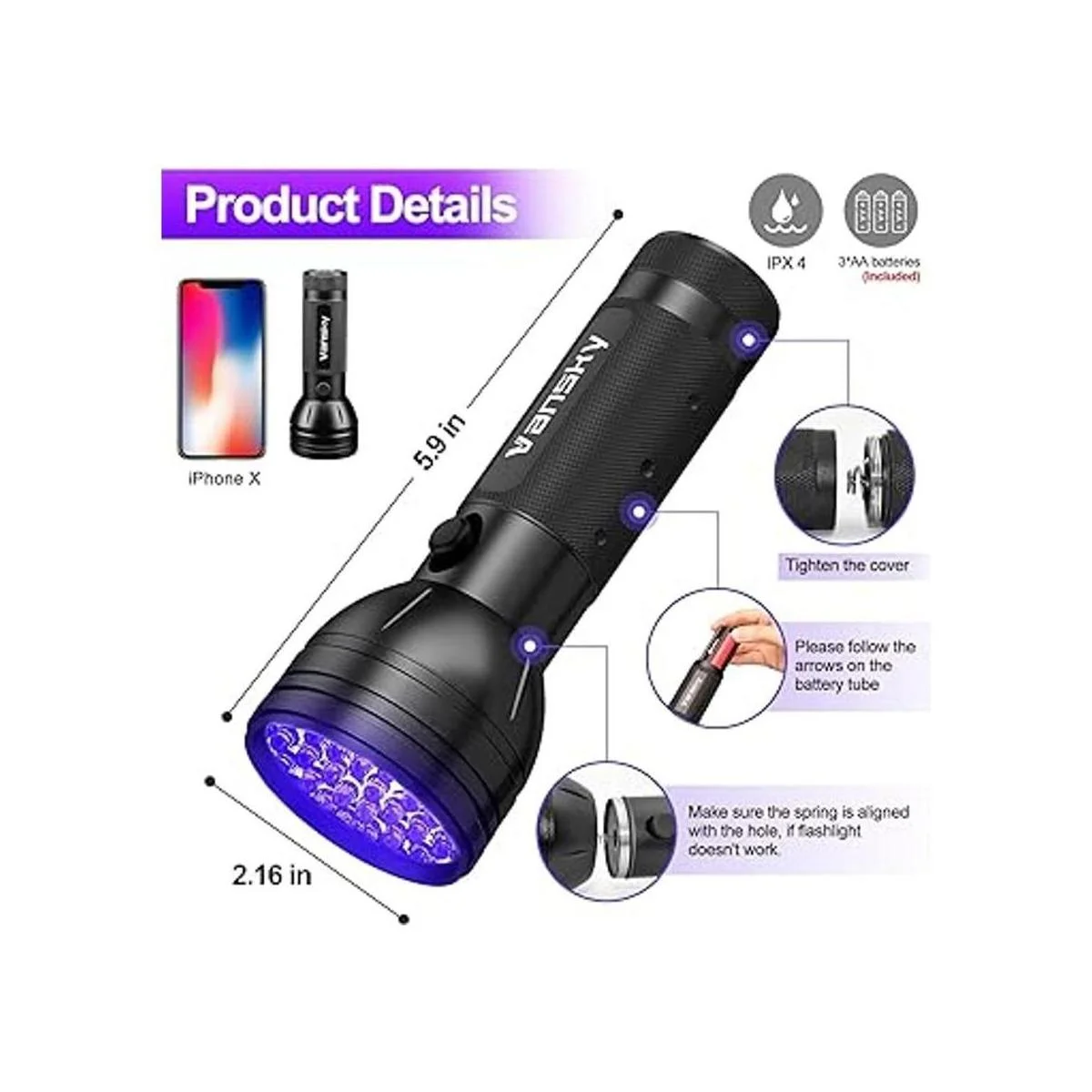 Garantía de calidad: la luz negra emite una longitud de onda de 395 nm con 51 linternas de alta calidad, cada LED dura hasta 12 años. Linterna de aleación de aluminio resistente para este detector de orina.