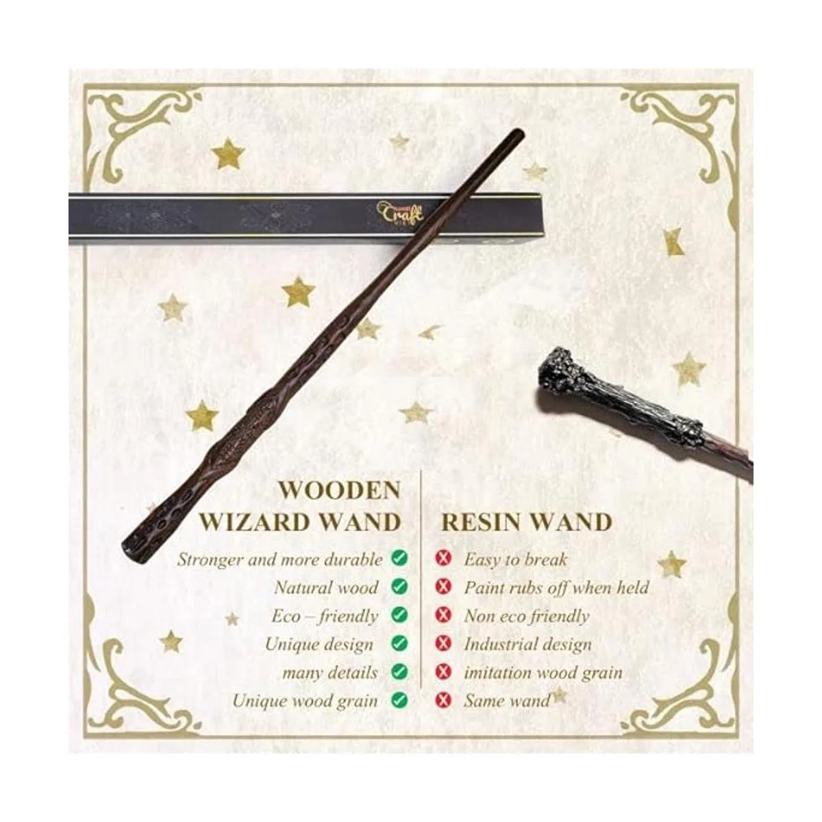 Madera auténtica: esta varita de madera está hecha a mano con madera maciza de Santa María, adecuada para hacer pequeños detalles delicados, y muy duradera, no es fácil de romper. Hecha de 100 madera maciza que es perfecta para un viaje imaginativo al mundo mágico de la brujería y la magia