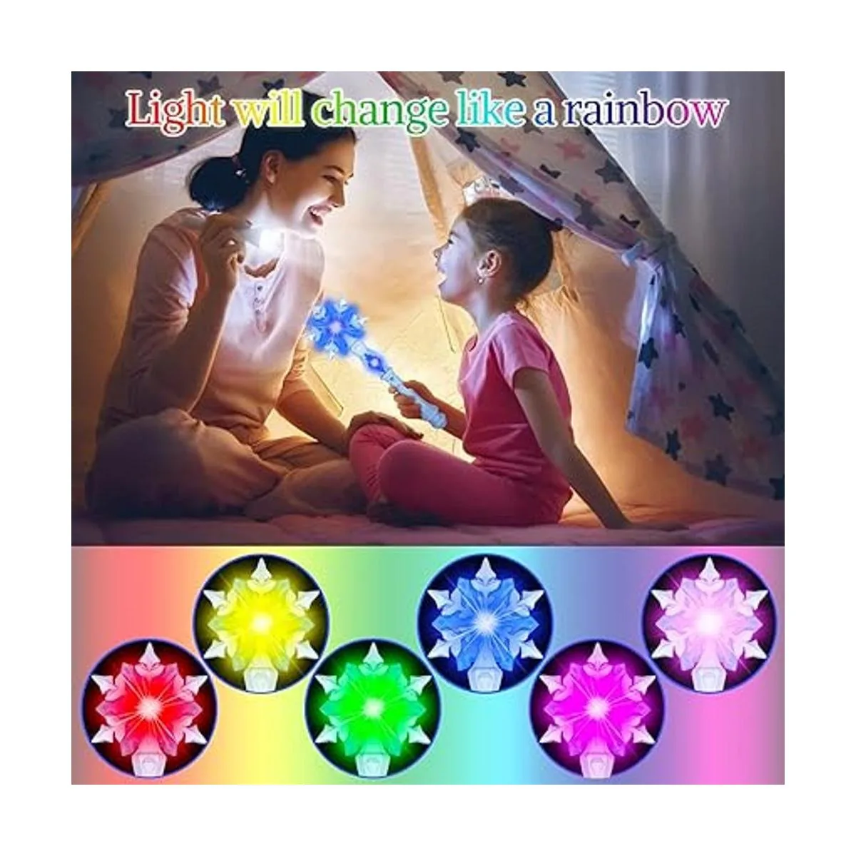 Iluminación llamativa: estas varitas mágicas están llenas de fascinantes efectos de luz, pulsa el botón, el copo de nieve de la parte superior de la varita cambiará 6 colores diferentes.
