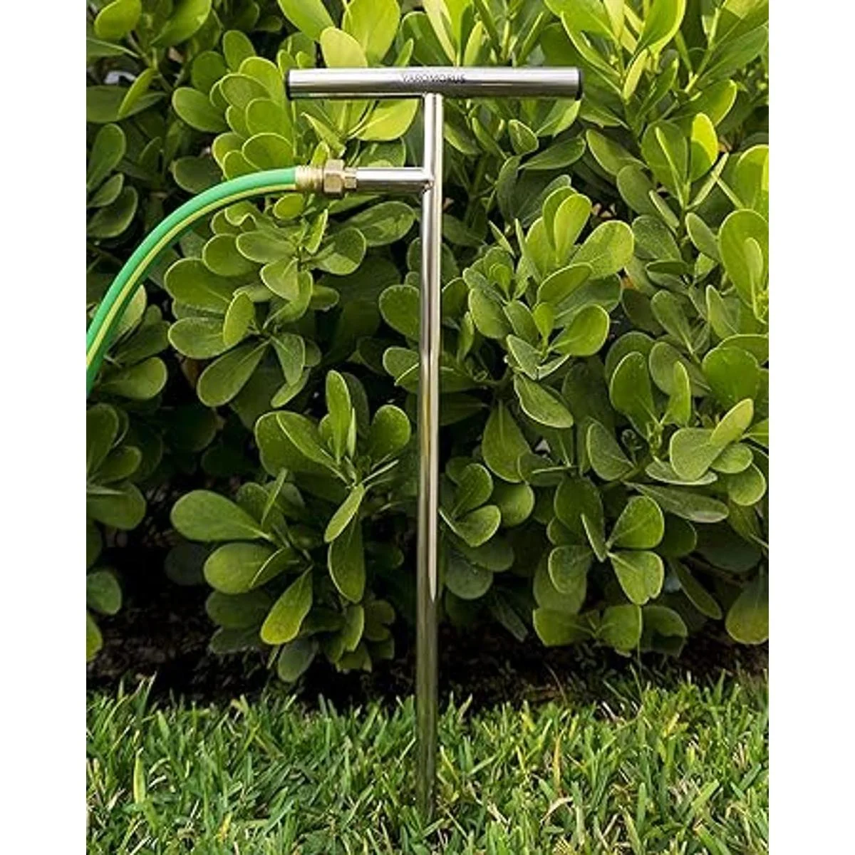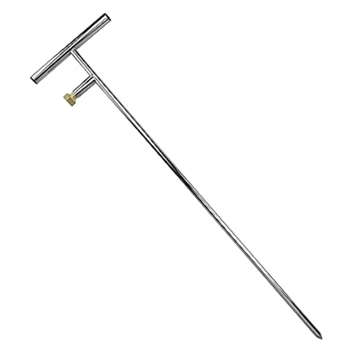 La herramienta de riego profundo está hecha de acero inoxidable y tiene una mano de obra de soldadura de calidad. Es una herramienta de jardín resistente al óxido, resistente y bien pulida que te servirá toda la vida. Cuenta con un mango estilo T, tubo con una punta sólida puntiaguda y un accesorio de manguera. La herramienta mide 37 pulgadas de largo. Se puede insertar hasta 32 pulgadas de profundidad en el suelo.