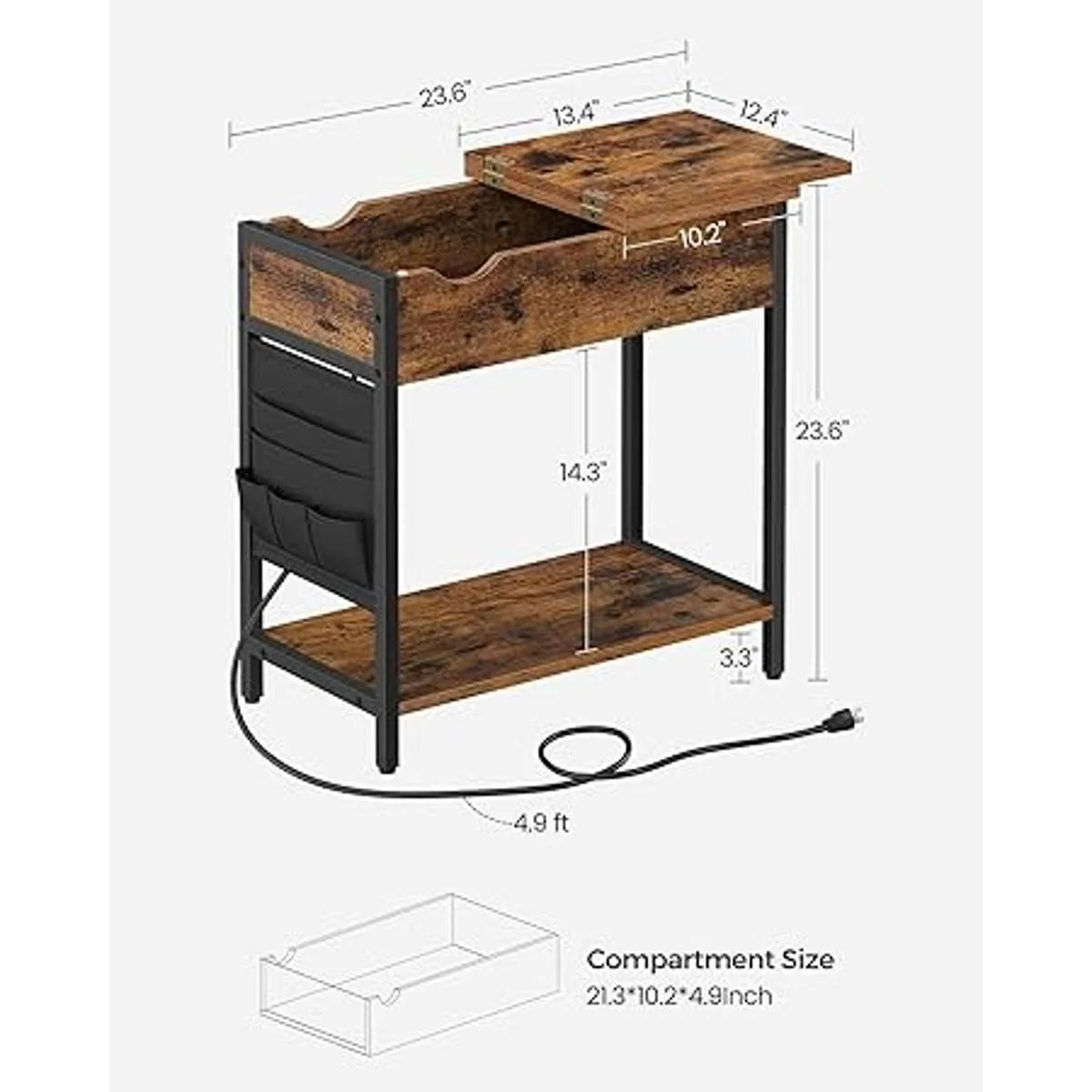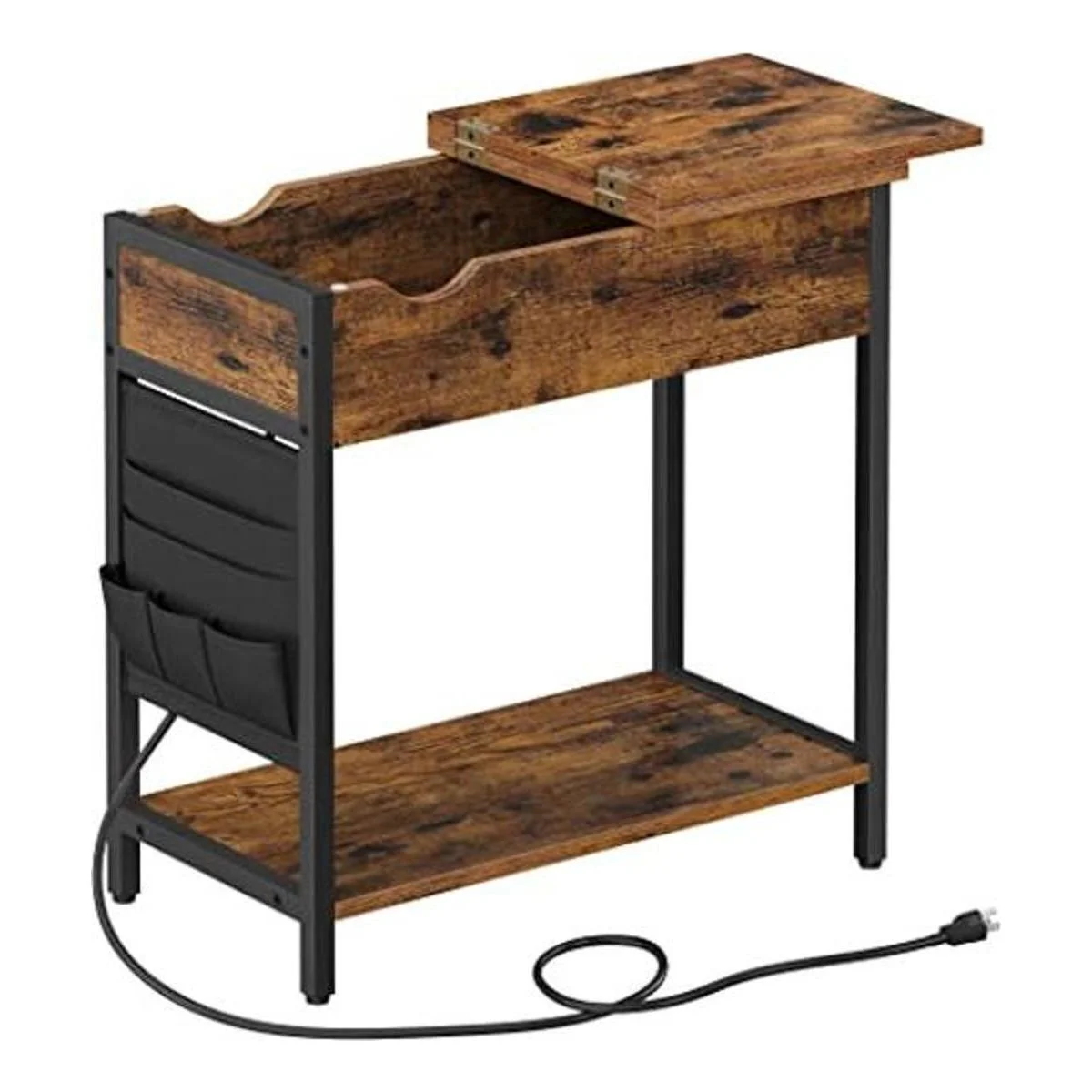 VASAGLE Mesa auxiliar con puertos USB y tomas de corriente, mesa auxiliar abatible con estación de carga, mesita de noche con estante de almacenamiento y bolsa de tela, para sala de estar, dormitorio, marrón rústico y negro ULET310B01V1