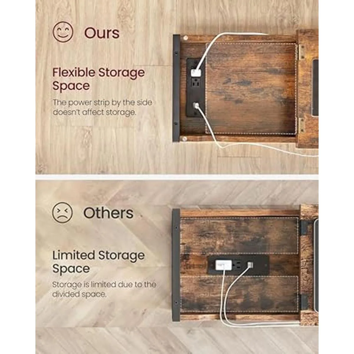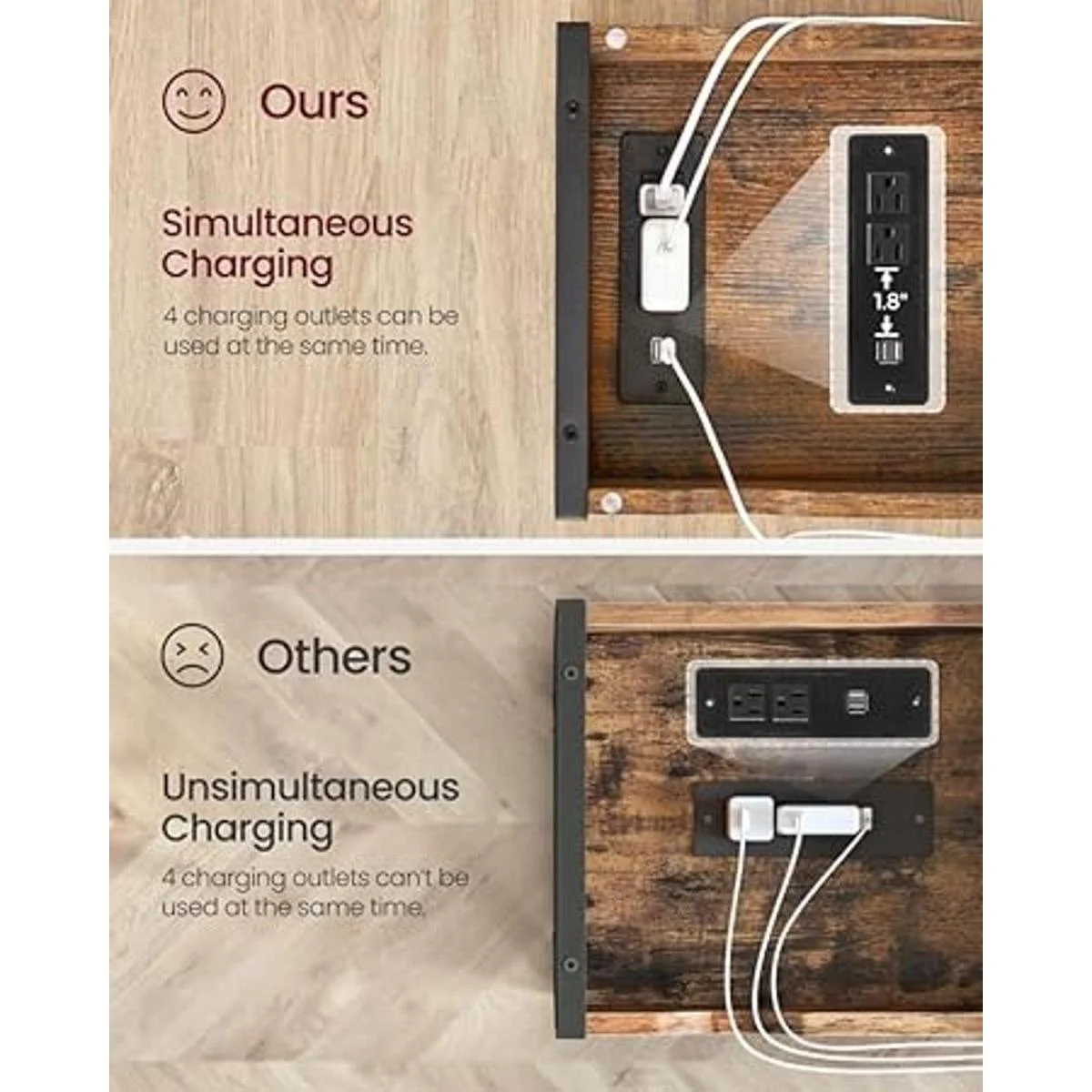 Potencia a tu lado: Batería baja No te preocupes. Esta mesa auxiliar viene con dos tomas de corriente de 3 clavijas y dos puertos USB con un cable eléctrico de 4.9 pies de largo para satisfacer tus necesidades de carga. Además, la distancia adecuada entre los enchufes garantiza que no haya que luchar por una toma de corriente