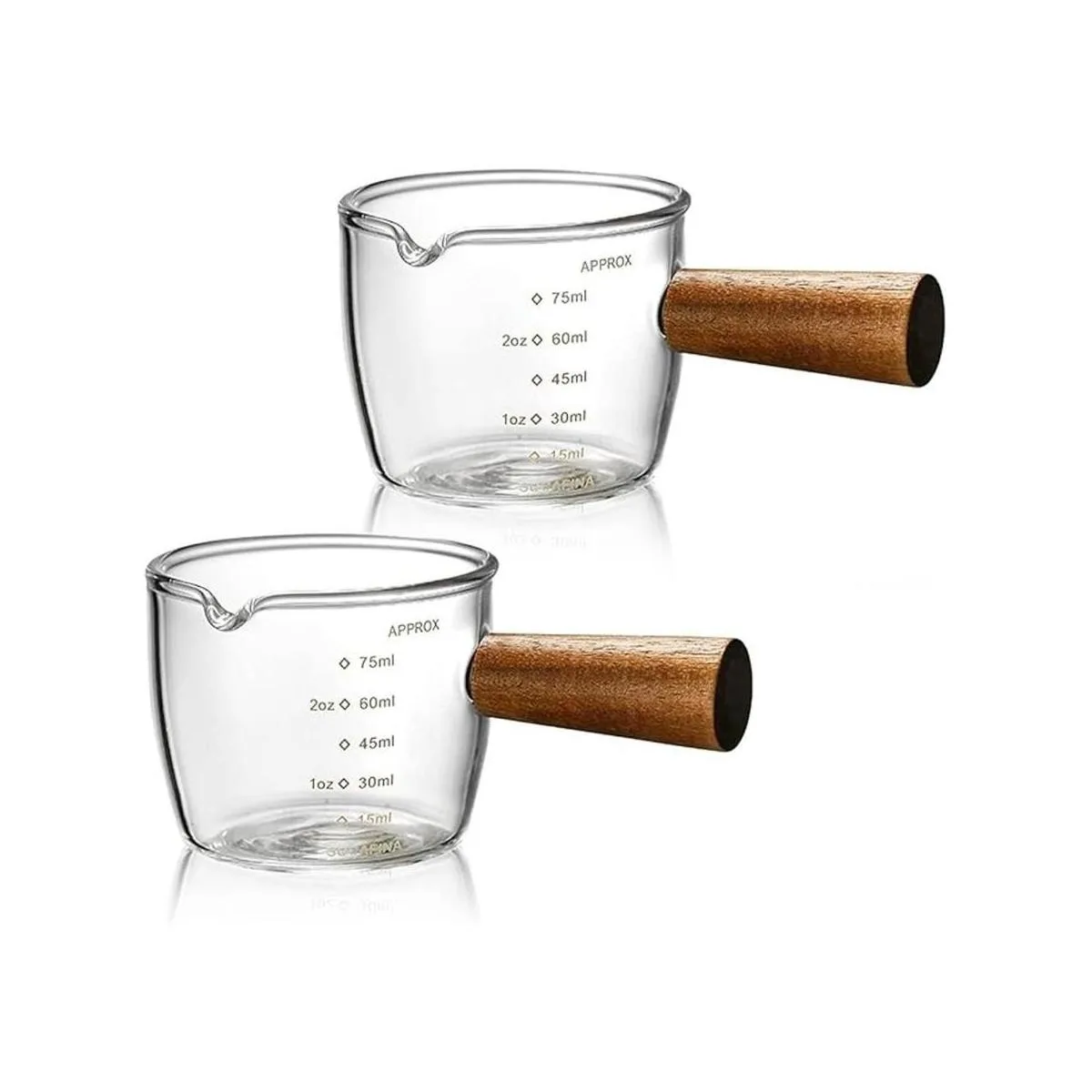 Vaso de chupito de café expreso con mango de madera, taza medidora triple jarra de leche, jarra de repuesto para café Barista, jarra de café, jarra de café y leche espresso, 2.5 fl oz (2 piezas)