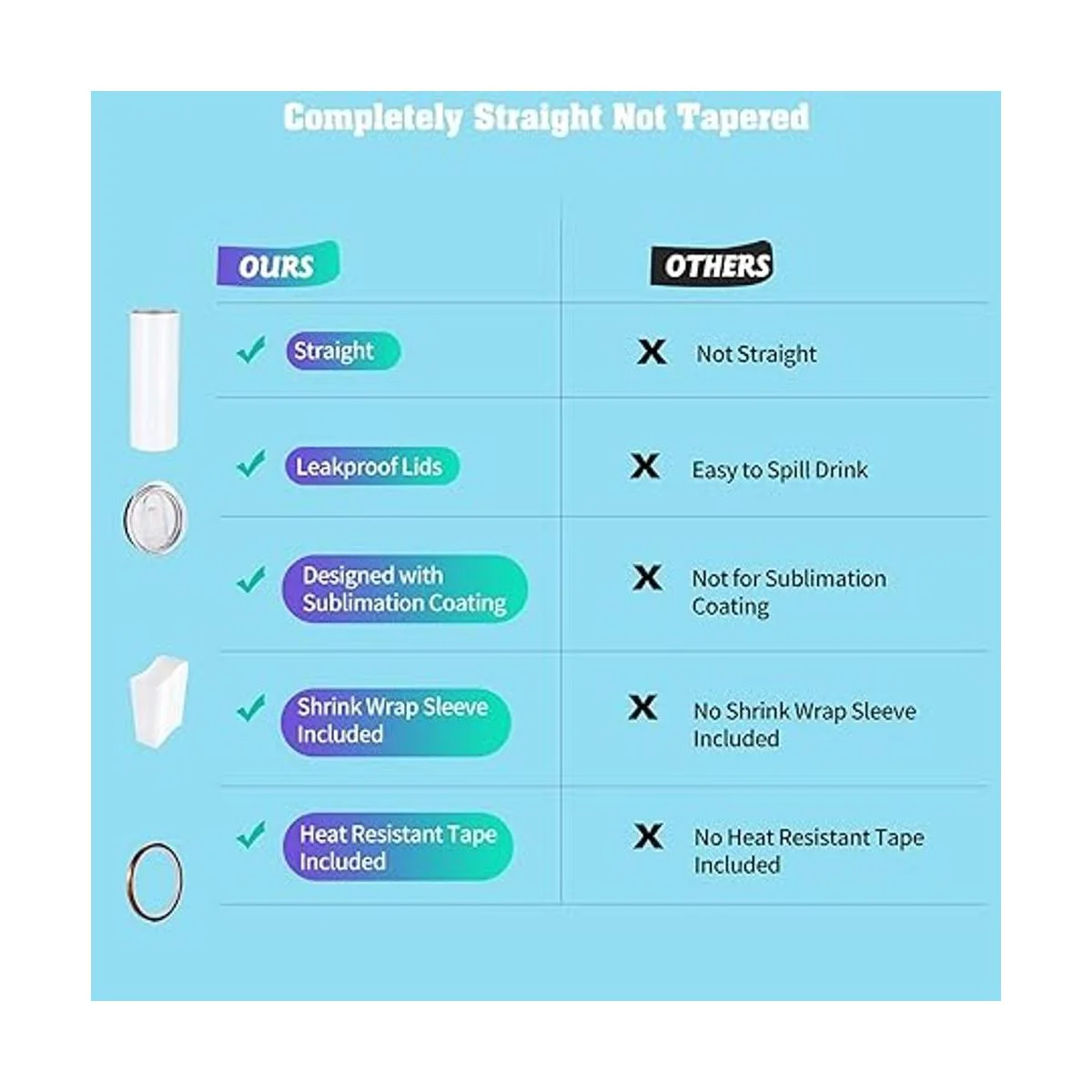 Totalmente recto: este vaso delgado de sublimación en blanco es completamente recto, no cónico, lo que es fácil hacer la impresión por sublimación completa.