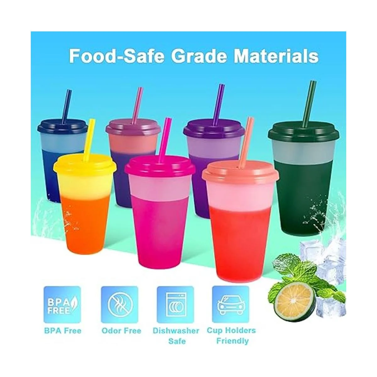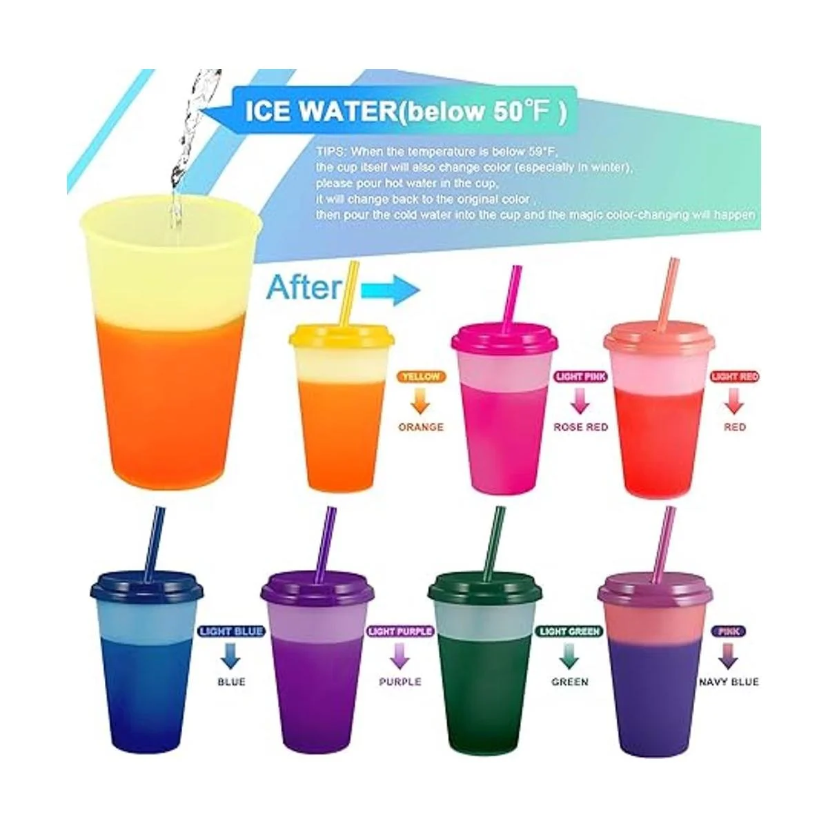 Tazas que cambian de color: simplemente añade agua fría o tu bebida helada favorita en estos vasos fríos de plástico, verás un divertido cambio de color en estas tazas frías. Consejos: cuando la temperatura es baja y inferior a 59 F, la taza en sí también cambiará de color especialmente en invierno