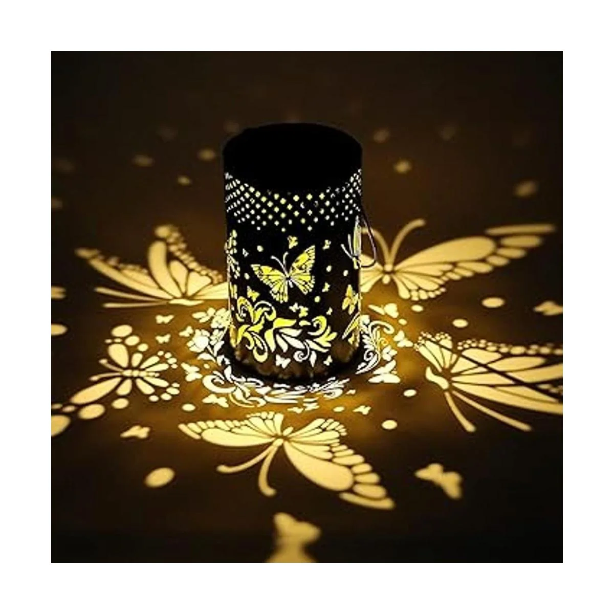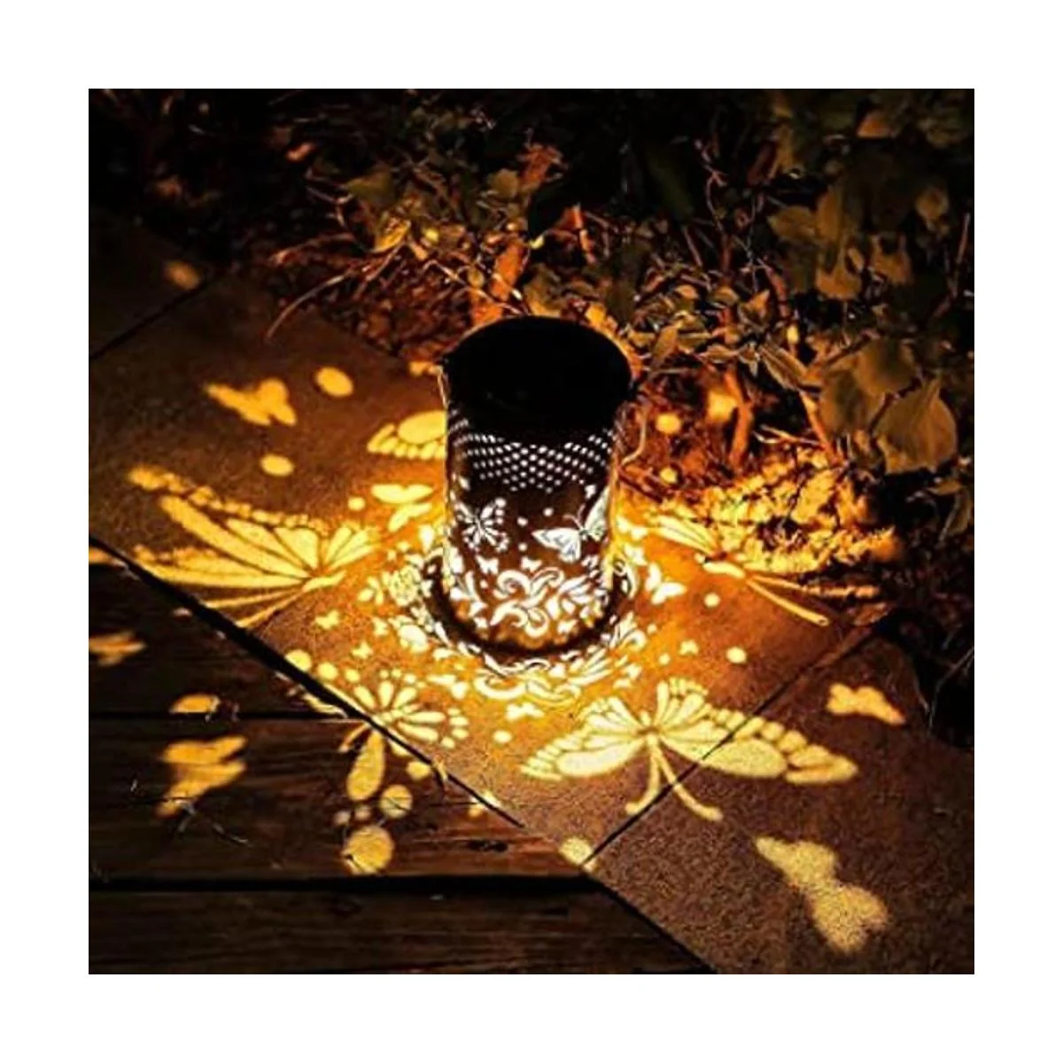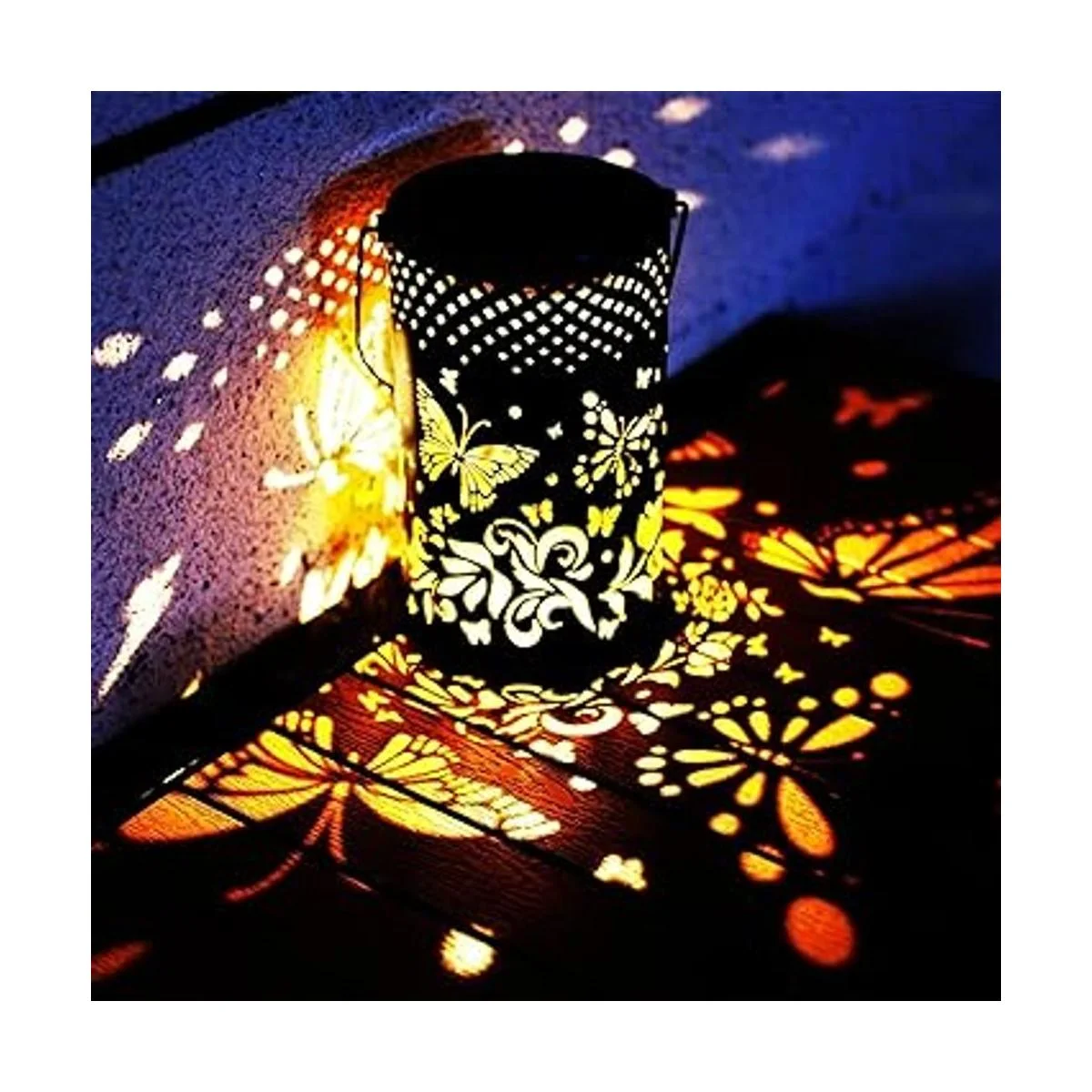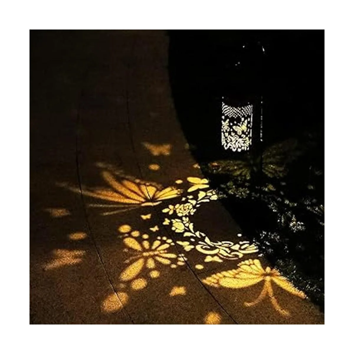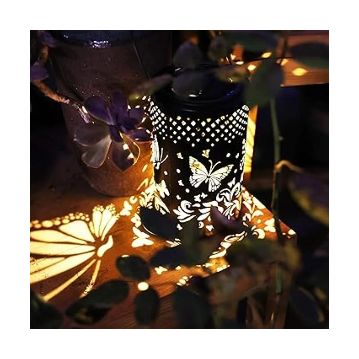 Patrón de flores y mariposas huecas: las linternas solares para exteriores emiten un brillo suave por la noche y muestran un bonito patrón de mariposa y flores en la mesa o el suelo. El cálido brillo es perfecto y tranquilo para una agradable noche al aire libre. Las linternas solares para exteriores pueden añadir un aspecto elegante al entorno circundante.