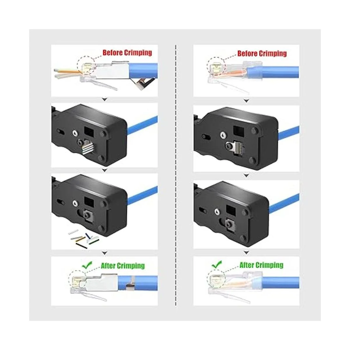 Diseño único: la herramienta de engarzado RJ45 también es adecuada para enchufes modulares blindados para engarzar los clips de cola de milano de metal, especialmente para pasar a través de enchufes modulares devotail.