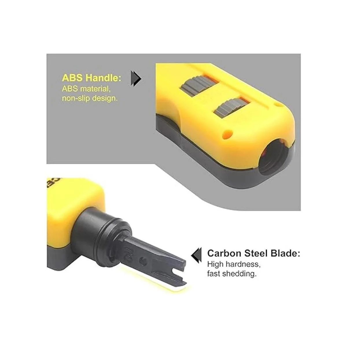 Herramienta de perforación de datos con hoja extraíble: diseño de doble cabezal de corte, corta el exceso de cables mientras perfora. Las cuchillas precisas son intercambiables y reversibles entre 110 y 66 estándares.