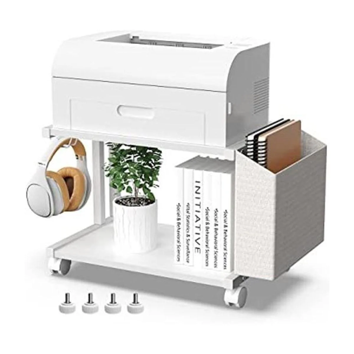 Fácil de usar, montaje fácil y blanco puro: las almohadillas deslizantes ajustables y las ruedas están incluidas. 4 ruedas con rotación de 360, 2 ruedas con bloqueo permiten una parada estable. La superficie impermeable facilita la limpieza. El soporte para impresora es fácil de montar con las instrucciones incluidas.