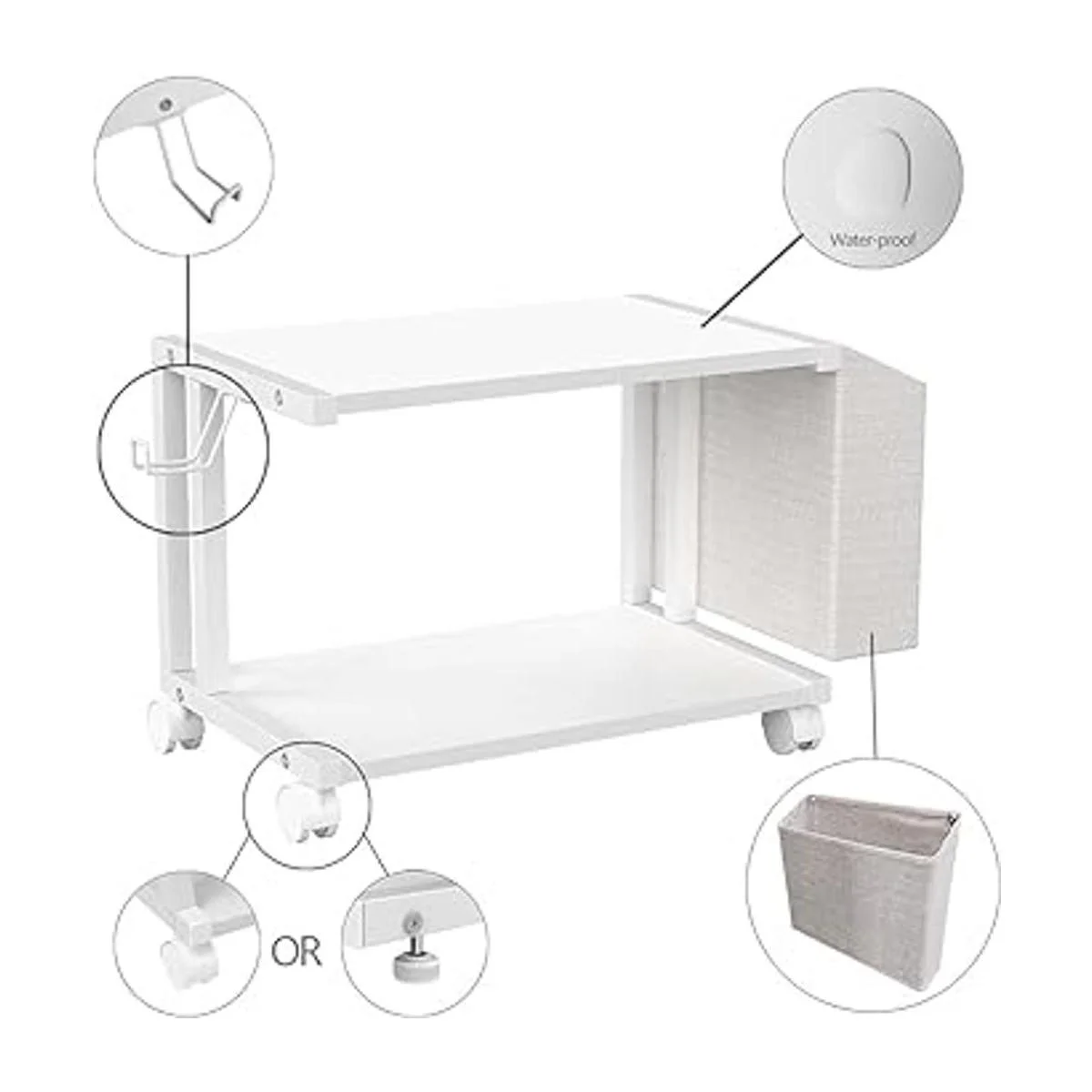 VEDECASA Soporte moderno de madera blanca de 2 niveles para impresora debajo del escritorio con bolsa de almacenamiento para el hogar, oficina, escritorio, impresora de mesa, organizador de mesa para impresora móvil, carrito con rueda giratoria blanco