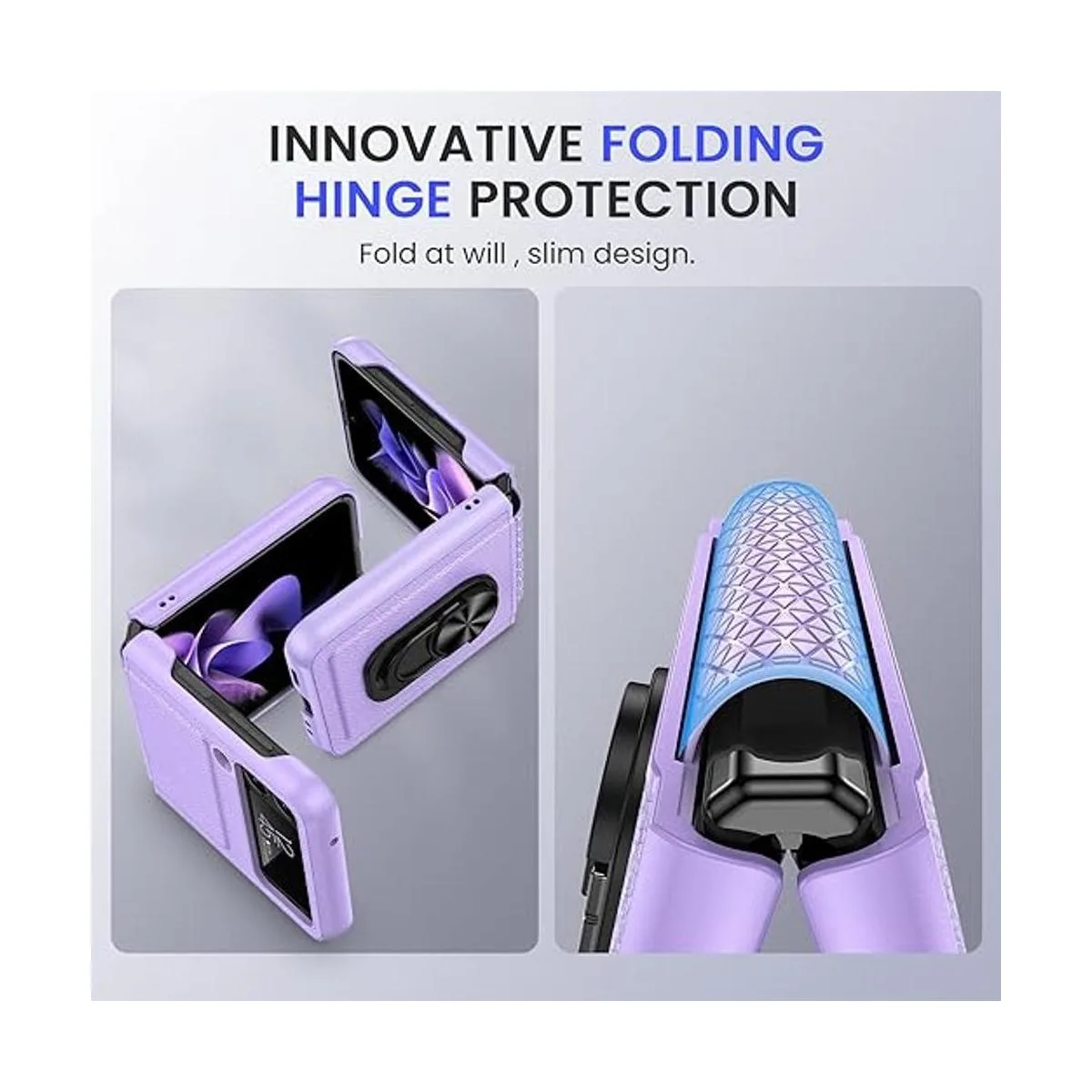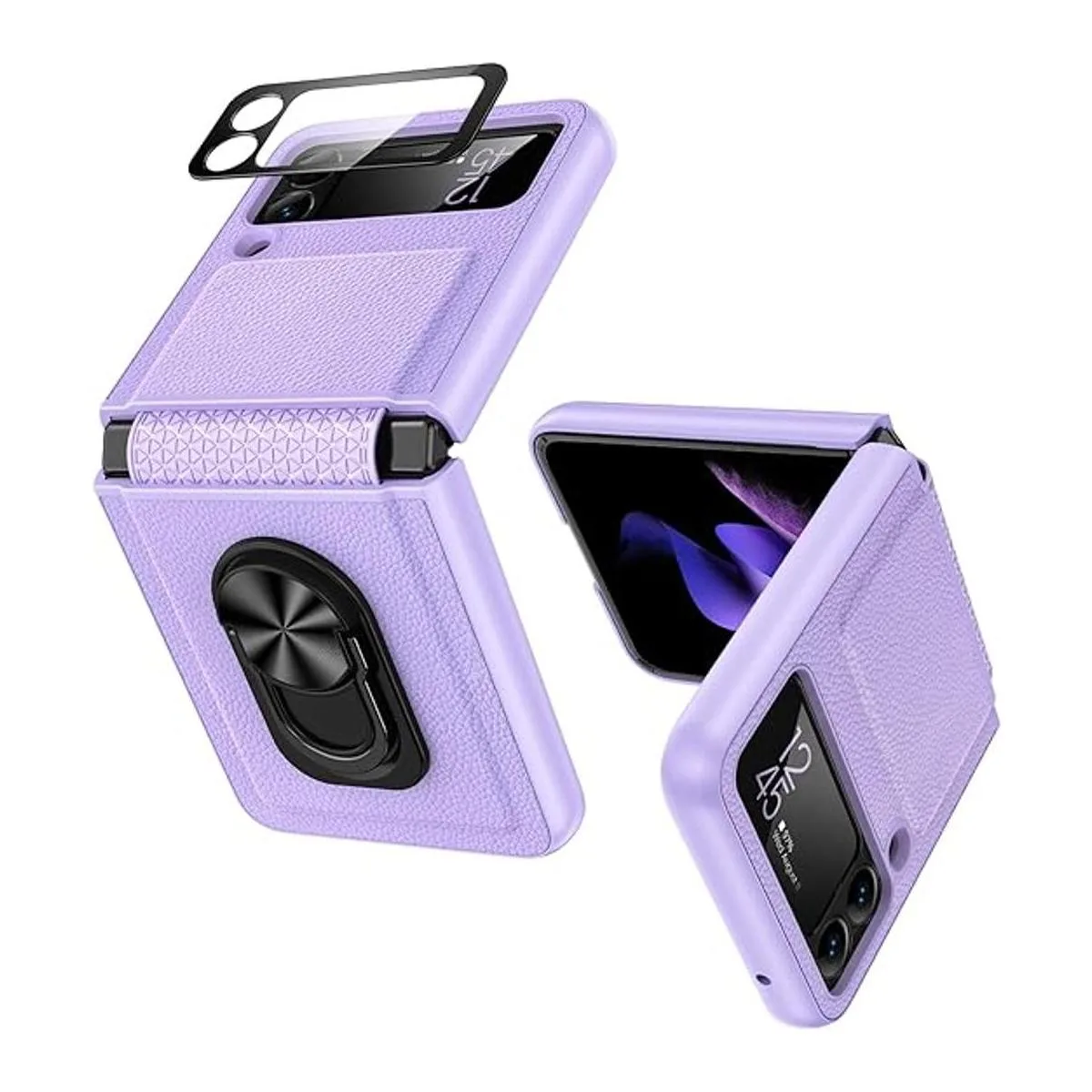 VEGO Funda con soporte para Galaxy Z Flip 3 anillas, Z Flip 3 todo incluido con protección de bisagra y protector de pantalla de lente de cámara de vidrio para Samsung Galaxy Z Flip 3 5G 2021, color morado