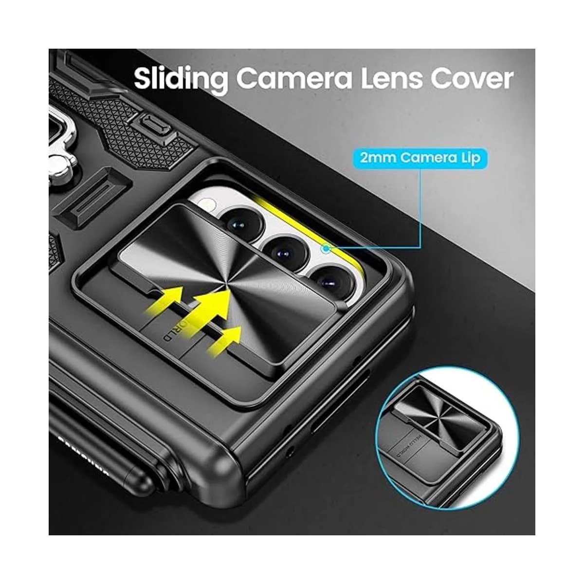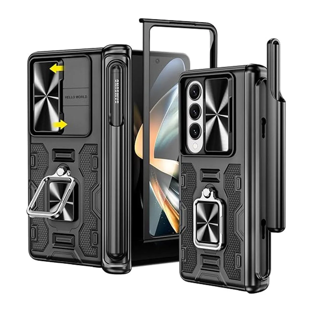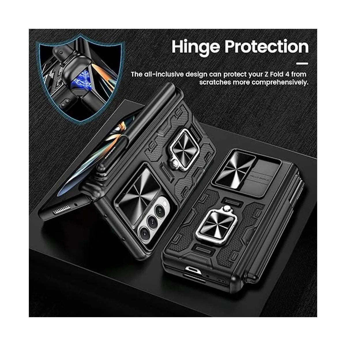 VEGO Funda para Galaxy Z Fold 4 con soporte para bolígrafo S, protección de bisagra soporte magnético de anillo de 360 cubierta de cámara deslizante protector de pantalla frontal Funda protectora para Samsung Galaxy Z Fold 4, color negro