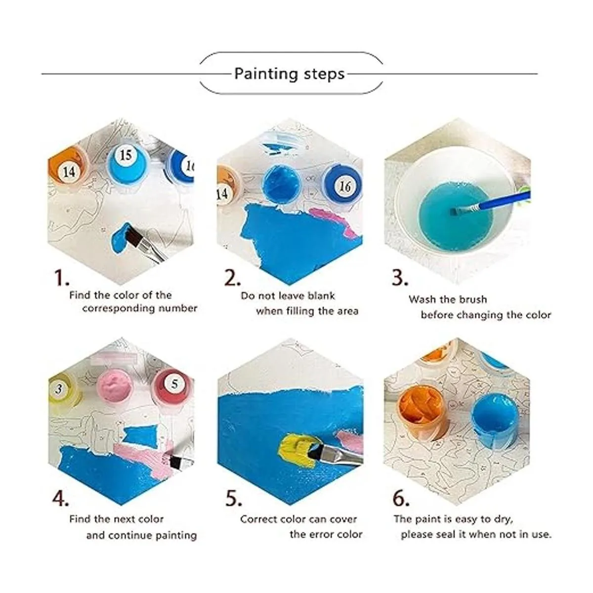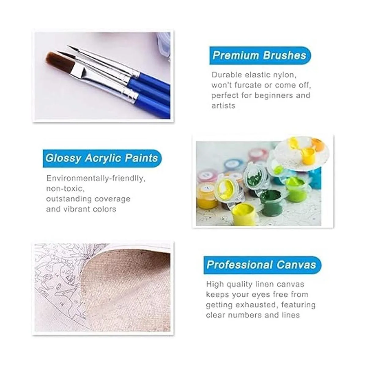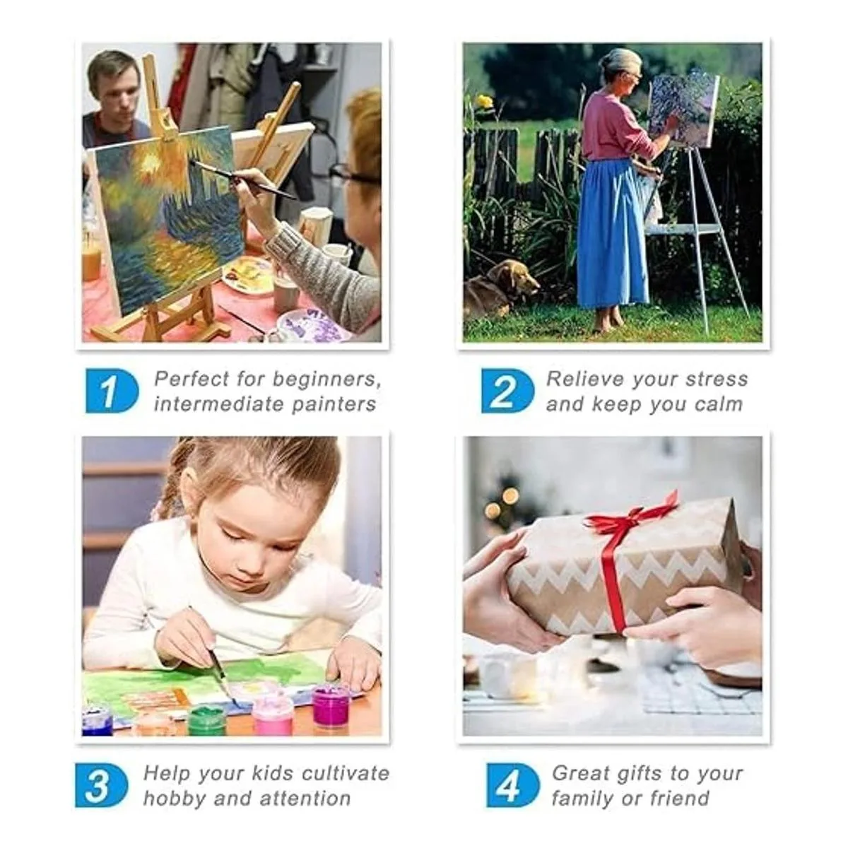 Lo que obtendrás: 4 lienzos preimpresos sin marco, 4 juegos de pintura acrílica, 12 pinceles de alta calidad, guía de postales de 4 colores, 4 copias de papel de lienzo numerado para referencia, 8 colgadores de metal.