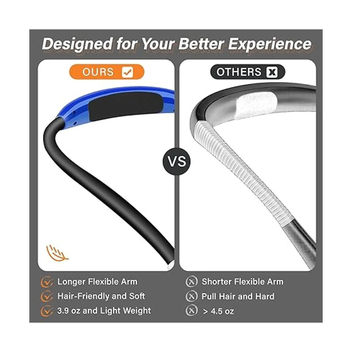 Cómodo de llevar Silicona ultrasuave que maximiza la comodidad de uso, incluso durante varias horas. Diseño ergonómico alrededor del cuello, se adapta a la línea de tu cuello. La parte táctil está equipada con una almohadilla suave. Perfectamente cómodo para leer en la cama, tejer, acampar, reparar, etc.