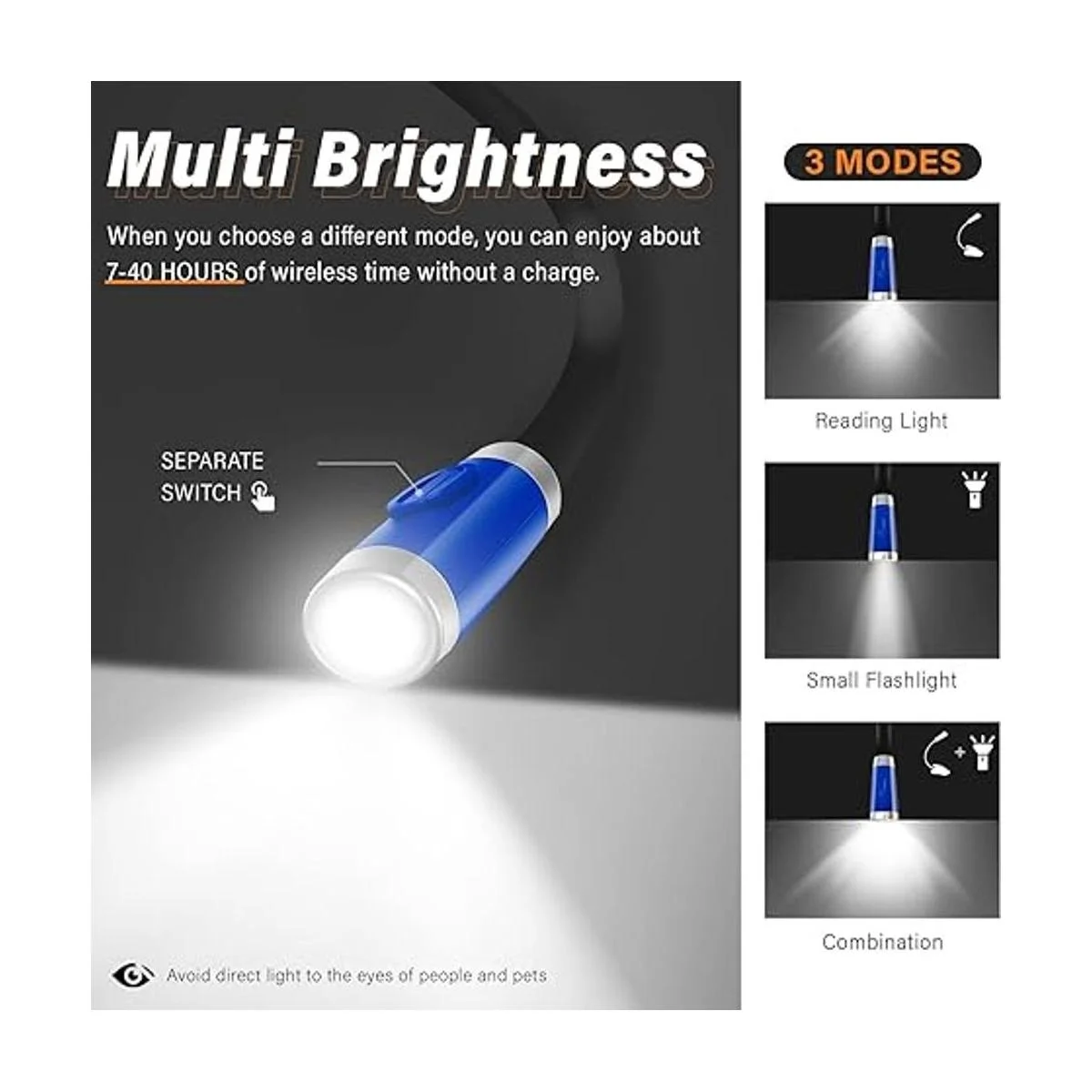 Súper brillo y cuidado de los ojos Equipado con 4 LED sin parpadeo y sin luz azul, te proporciona suficiente brillo para leer libros o tejer y evita la tensión ocular. Cada cabezal posee su interruptor separado para 3 niveles de brillo regulables.