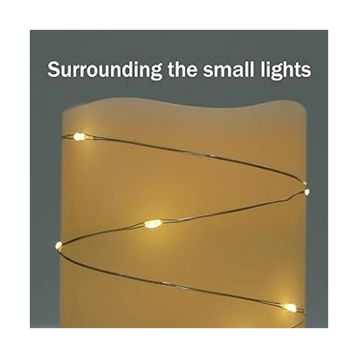 Cadena de luces integradas: cada vela está envuelta en cadena de luces de alambre plateado para proporcionar pequeños pero brillantes puntos de luz y un aspecto cautivador único.