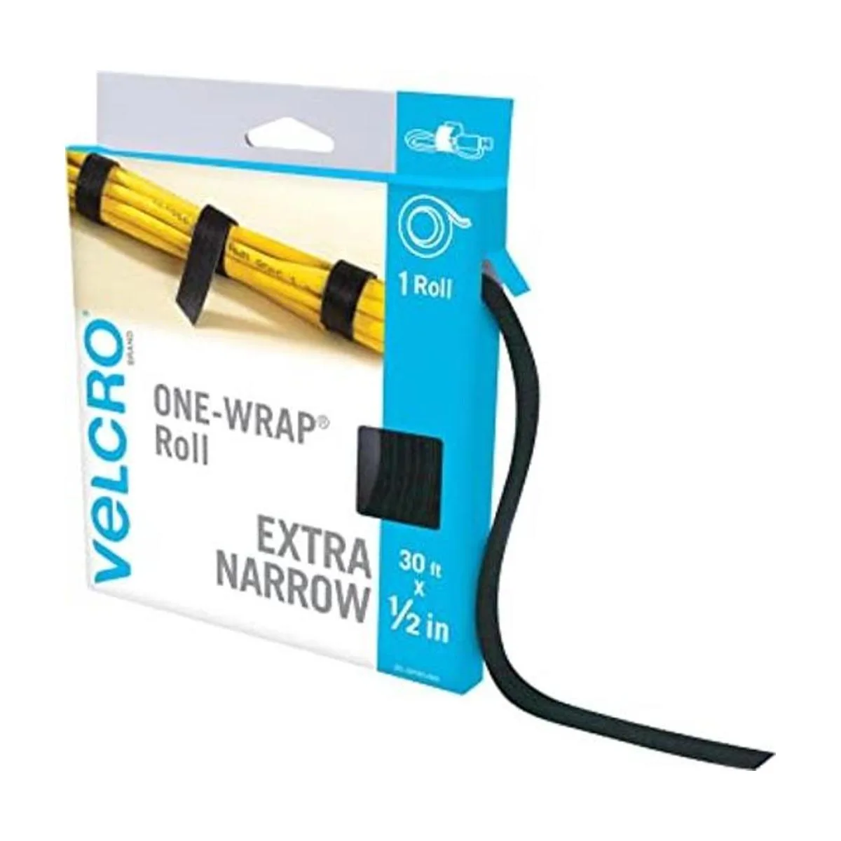 VELCRO Brand VEL30765AMS Correas extra estrechas rollo de 12 pulgada x 30 pies, cinta autoagarre reutilizable cortada a la longitud, organiza y agluta cables eléctricos, cuerdas, soluciones de gestión de cables, bridas de alambre, color negro