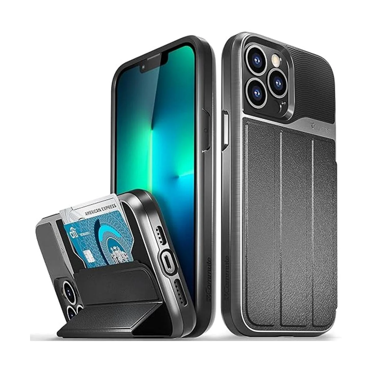 Vena Funda tipo cartera compatible con Apple iPhone 13 Pro Max 6.7 pulgadas, vCommute protección contra caídas de grado militar con tapa de cuero con ranura para tarjetas con soporte gris espacial