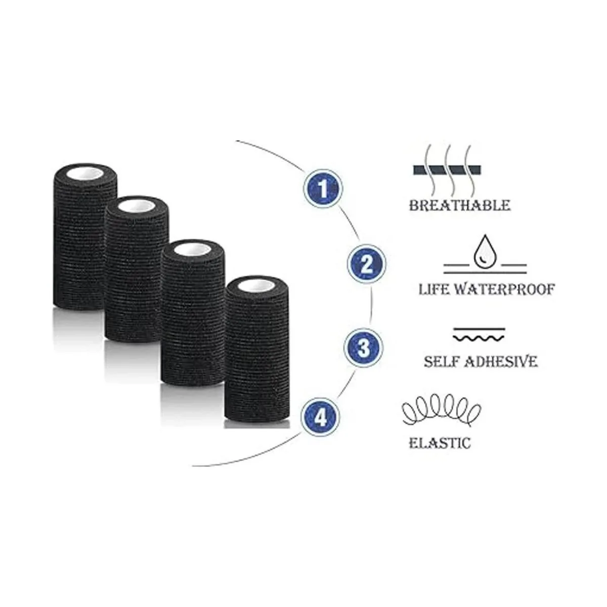 Tamaño del vendaje autoadhesivo: cada rollo de vendaje autoadhesivo es de 4 pulgadas x 5 yardas. Viene con 4 rollos de cinta de tatuaje cohesiva. Cantidad adecuada para su uso. Color: negro. El vendaje es ampliamente utilizado tanto para humanos, mascotas como para tatuajes