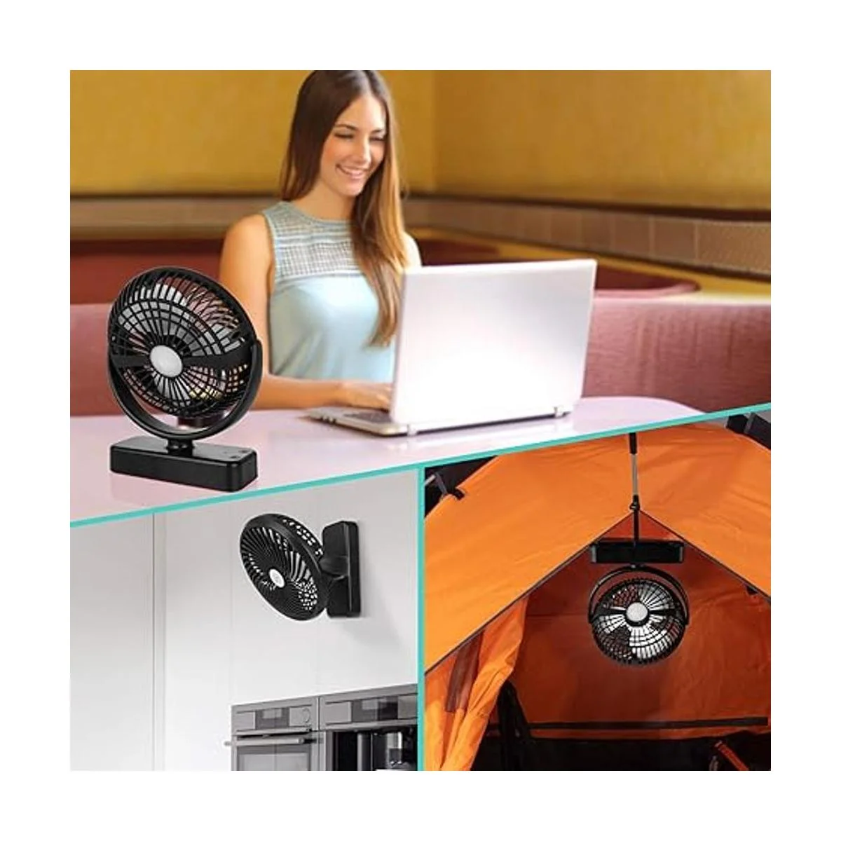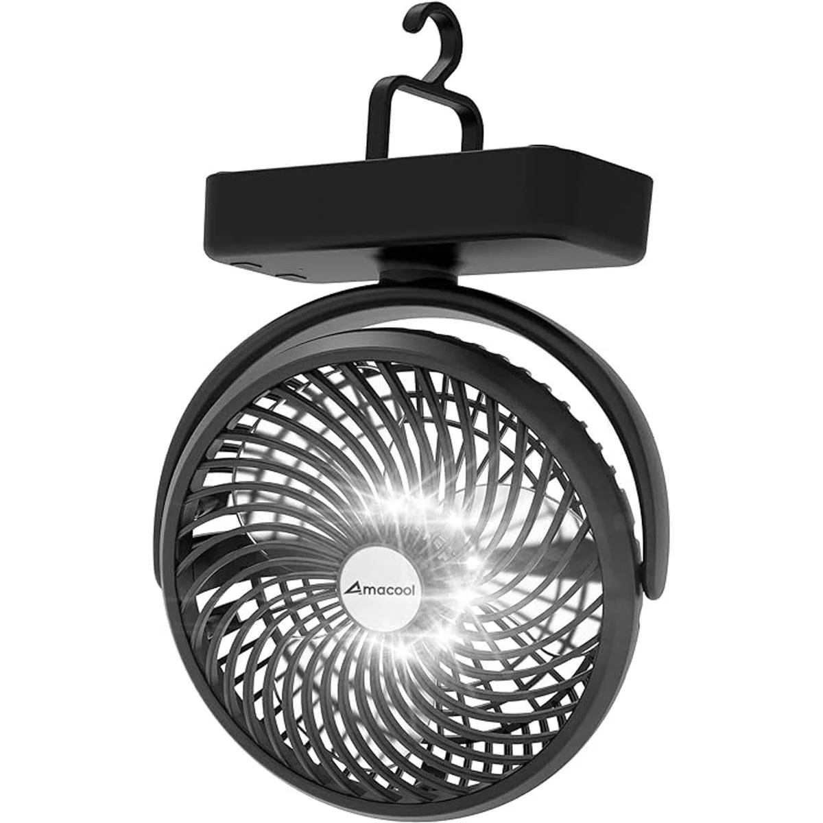 Ventilador de campamento con pilas de 10000 mAh con luz LED, ventilador USB de 7 pulgadas con gancho para colgar para tienda de campaña, automóvil, caravana, huracán, emergencia