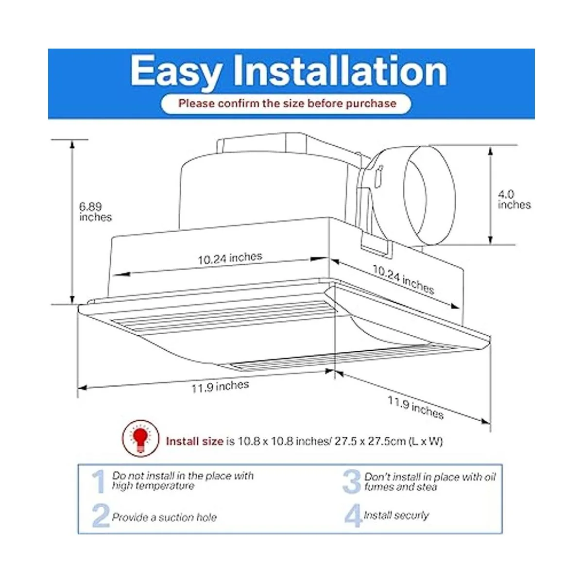 Dimensiones de la carcasa: ten en cuenta que el tamaño del panel es de 11.9 x 11.9 in largo x ancho, el tamaño de instalación es de 10.8 x 10.8 in largo x ancho, el diámetro del conducto es de 3.9 in, cambiando el tamaño de tu apertura de techo existente será necesario si tu La carcasa del ventilador actual es más pequeña. Consejo: el producto se fija directamente al techo caído por nuestros tornillos de metal; utiliza los accesorios que proporcionamos; confirma el tamaño antes de comprar