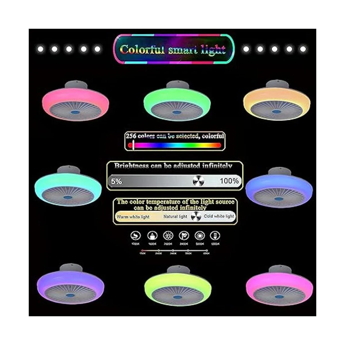 Multifunción: iluminación de ventilador de techo para dormitorio con control remoto, regulador, ajuste de temperatura de color, ajuste de brillo, ajuste de velocidad de viento de 3 canales, modo de suspensión, función de temporizador de apagado, ventilador conmutable. Altavoz Bluetooth, efecto de luz musical RGB.