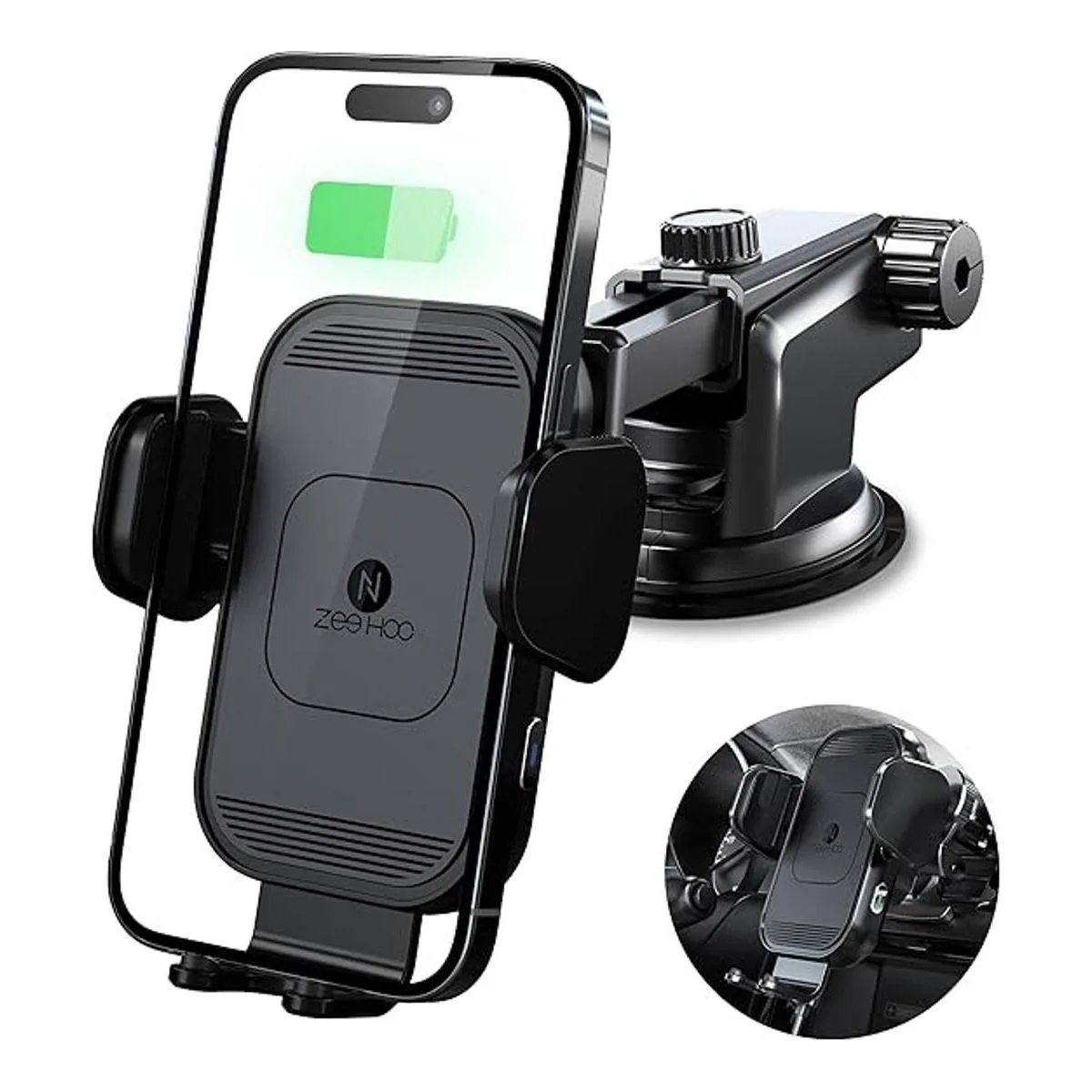 Versión mejorada Cargador inalámbrico de automóvil ZeeHoo, 15 W, Qi, carga rápida, soporte de auto de sujeción automática, soporte de ventilación de aire para parabrisas para iPhone 14, 13, 12, Mini 11 Pro Max, Samsung S22 S21, etc. negro