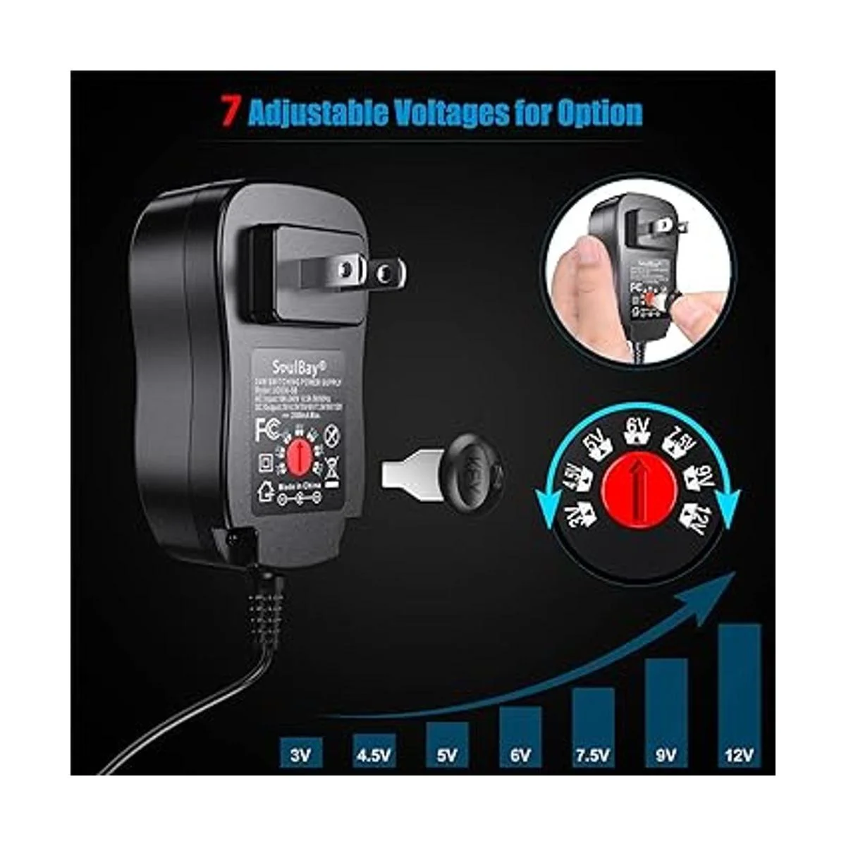Versión mejorada SoulBay Adaptador universal ACDC de múltiples voltajes regulados con 8 enchufes adaptadores seleccionables, para electrónica doméstica de 3 V a 12 V, 2 amperios máximo