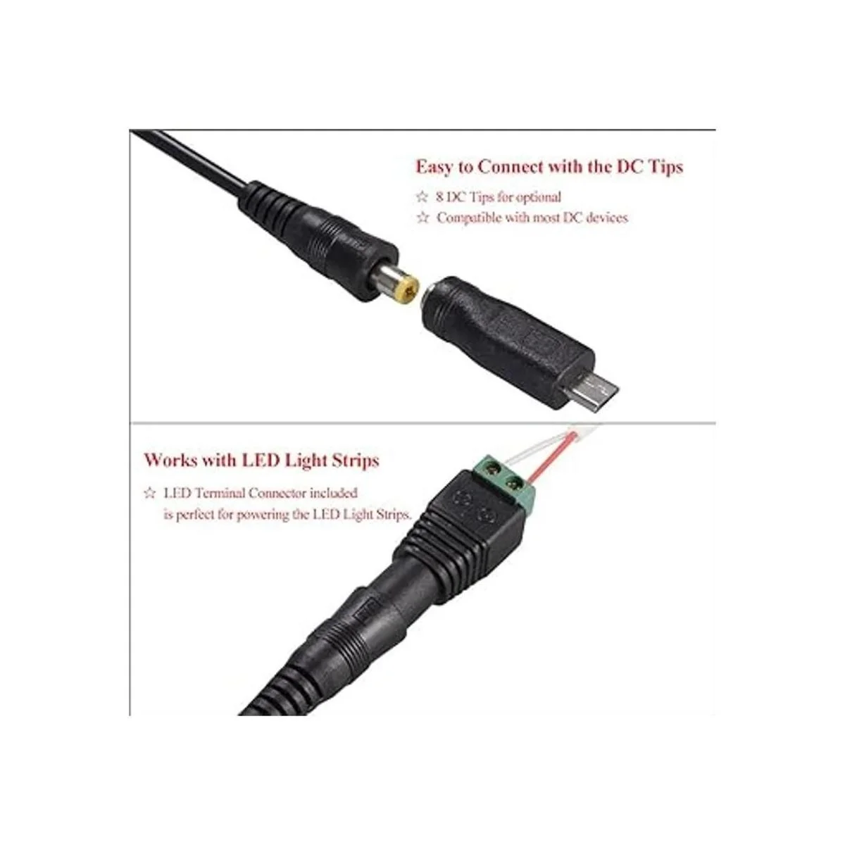 Versión mejorada de fuente de alimentación: hecha de material compacto. Conectores adaptadores de nuevo diseño para hacer que este adaptador se conecte más fácilmente, nuevo cable de 57.1 pulgadas de longitud, añadiendo un anillo magnético y conector de terminal LED. También hay un enchufe micro USB para que este artículo también pueda funcionar como un adaptador para convertir cualquier cable USB en un cargador, como cámara de carga USB.