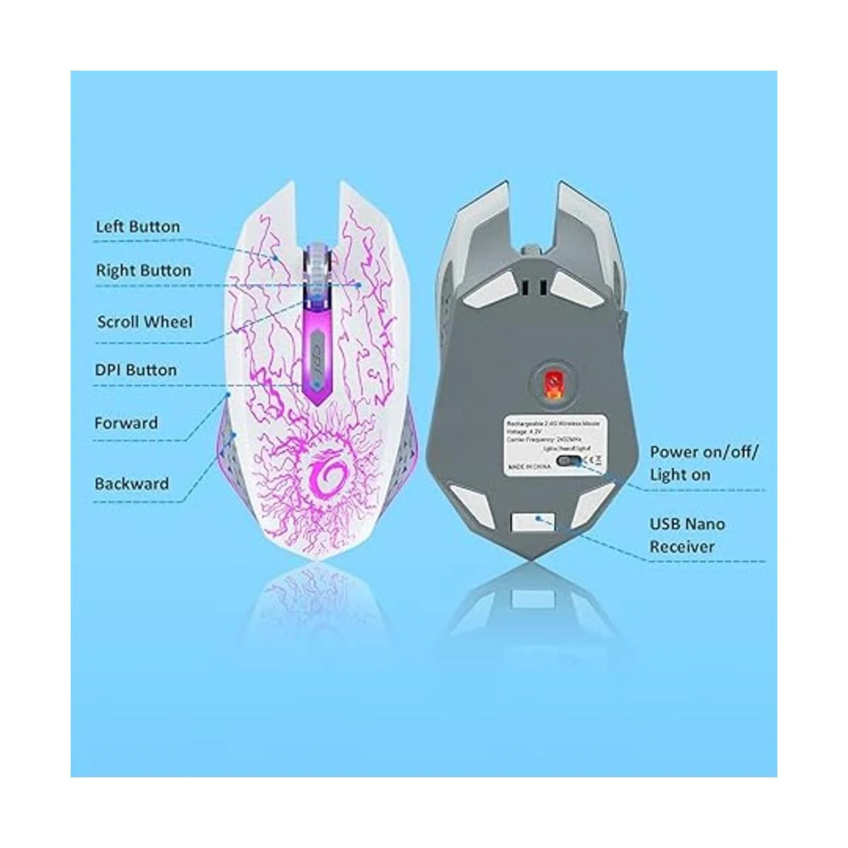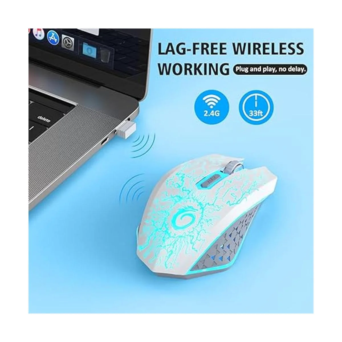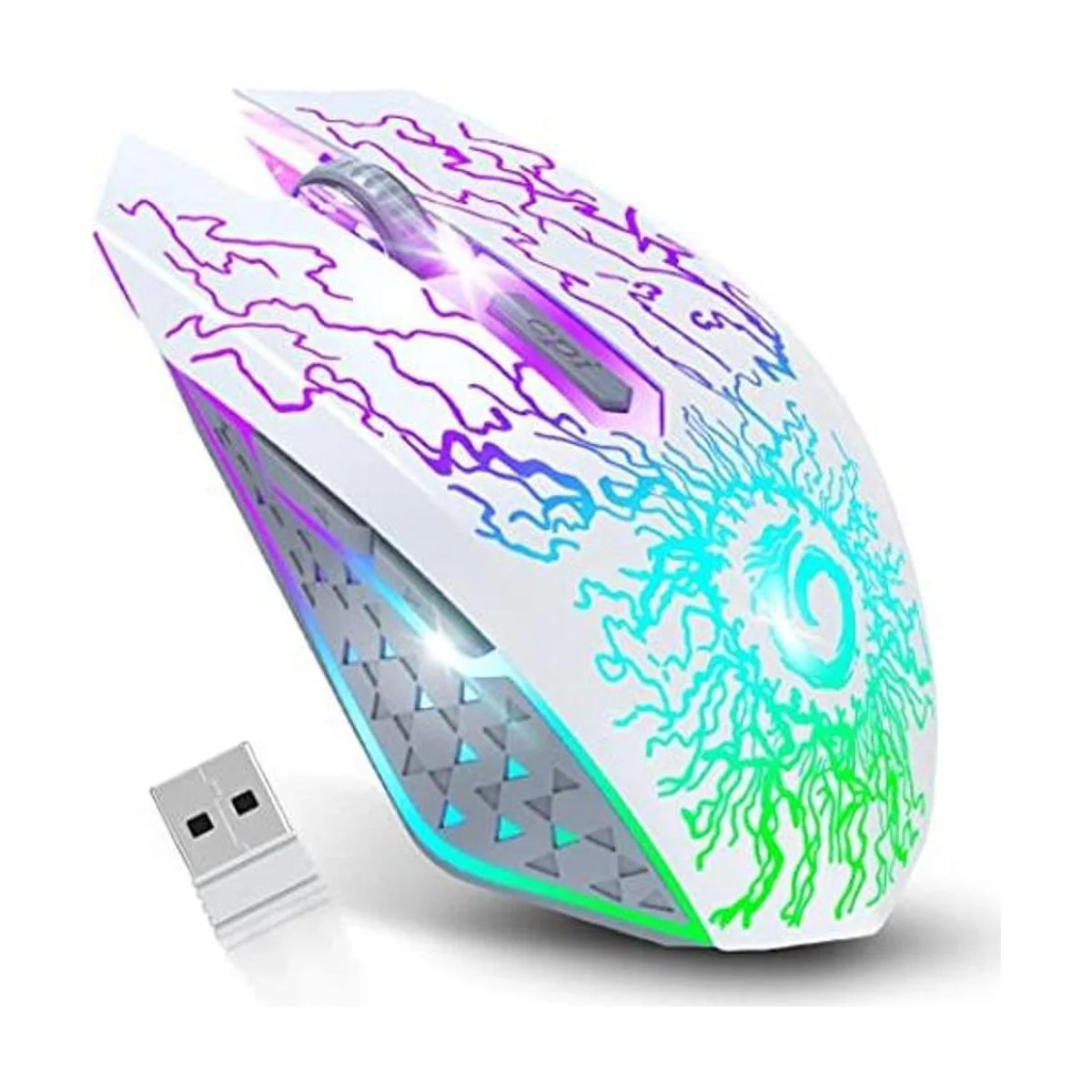 Luz de respiración RGB de 7 colores: diseño único de rayo agrietado que combina con luz LED de respiración de 7 colores, múltiples colores cambian automáticamente, resalta la atmósfera de juegos, especialmente por la noche. Ten en cuenta que el modo de luz acelerará el consumo de la batería, apagará la luz mientras no utilices el mouse.