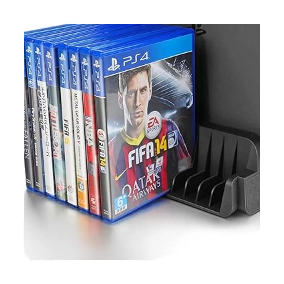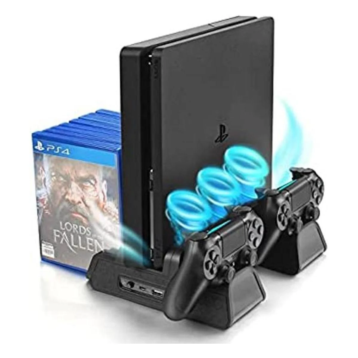 El soporte de consola vertical viene con 3 potentes ventiladores, cargador de controlador dual PS4, puerto USB y almacenamiento de 12 discos de juego