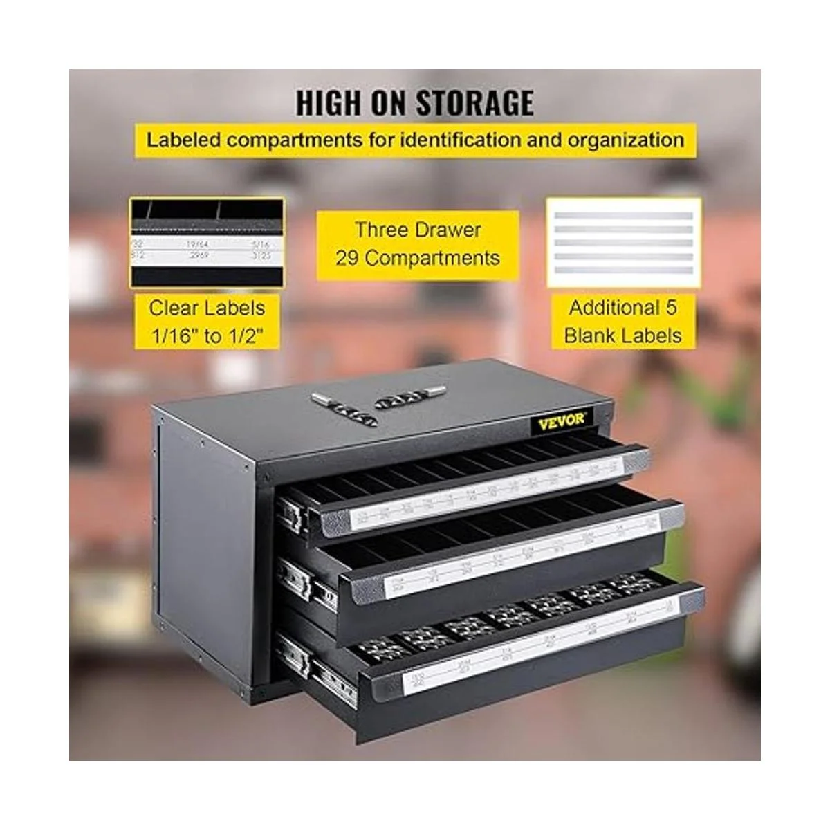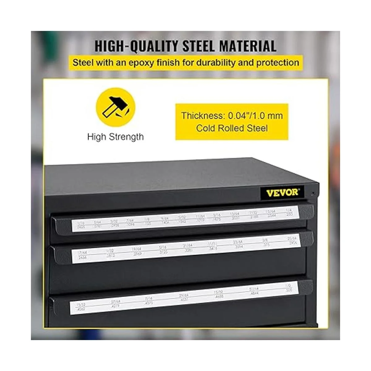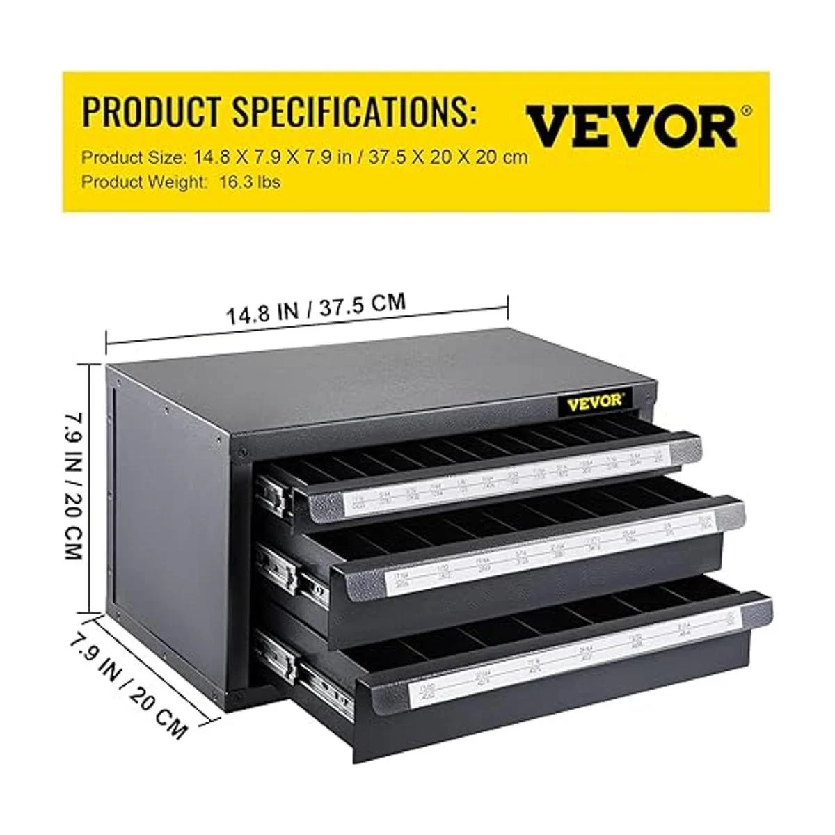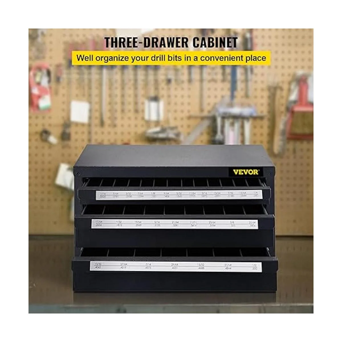 VEVOR Gabinete dispensador de brocas, dispensador de brocas de tres cajones, gabinete organizador de brocas, gabinete organizador de dispensador de taladro para longitud de trabajo, tamaño fraccional de 116 pulgadas a 12 pulgadas en incrementos de 164 pulgadas