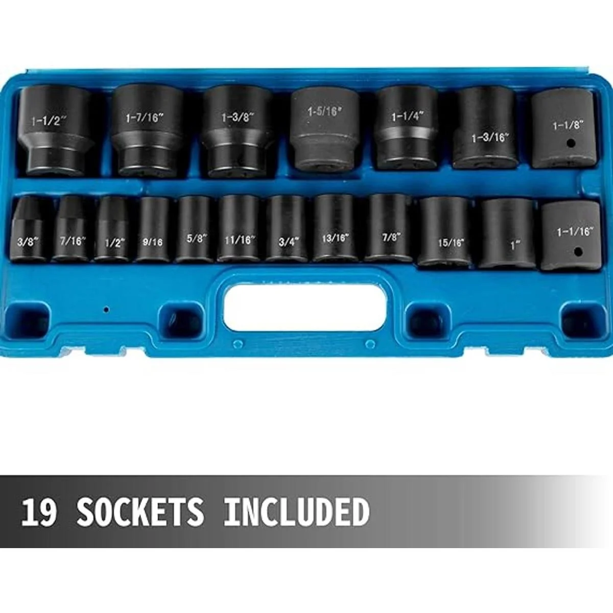 VEVOR Juego de llaves de impacto de 12 pulgadas 19 piezas, surtido de zócalos estándar, juego de llaves de vaso de 12 pulgadas de impacto estándar SAE 38 pulgadas a 112 pulgadas 6 puntos hexagonales
