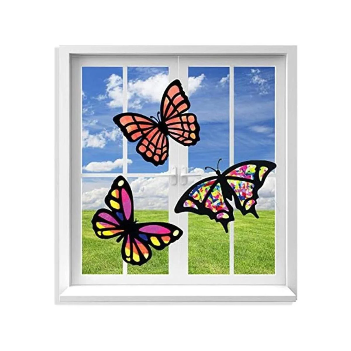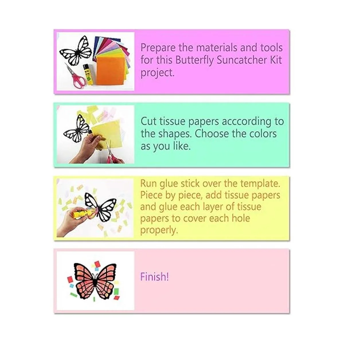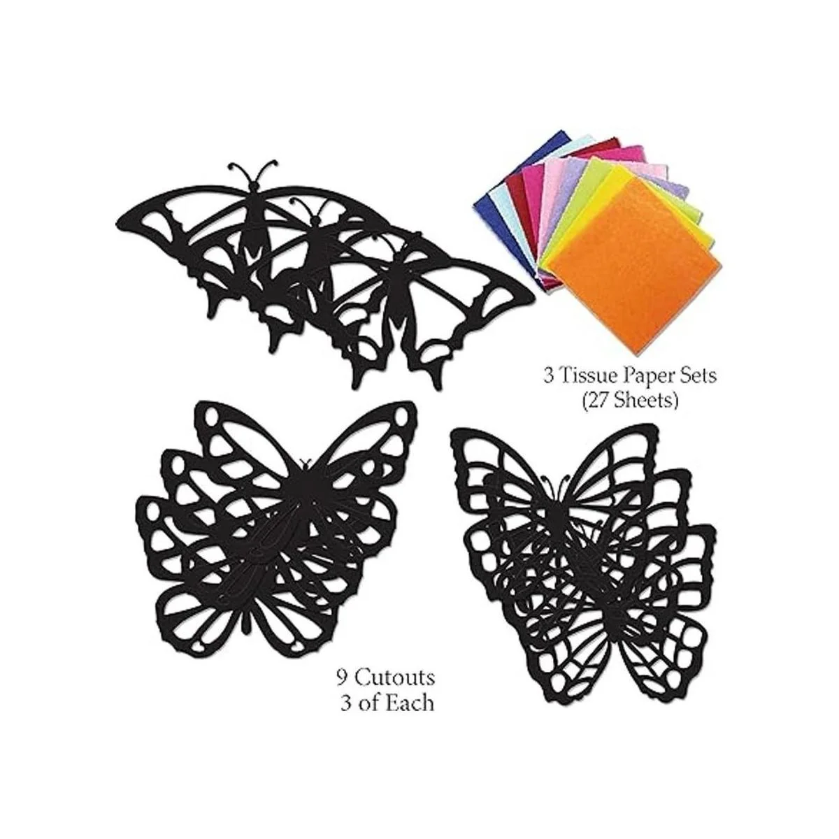 SUNCATCHER CRAFT BUTTERFLY Incluye 3 juegos de 3 plantillas de mariposa precortadas y 3 juegos de 9 papeles de seda de colores surtidos.