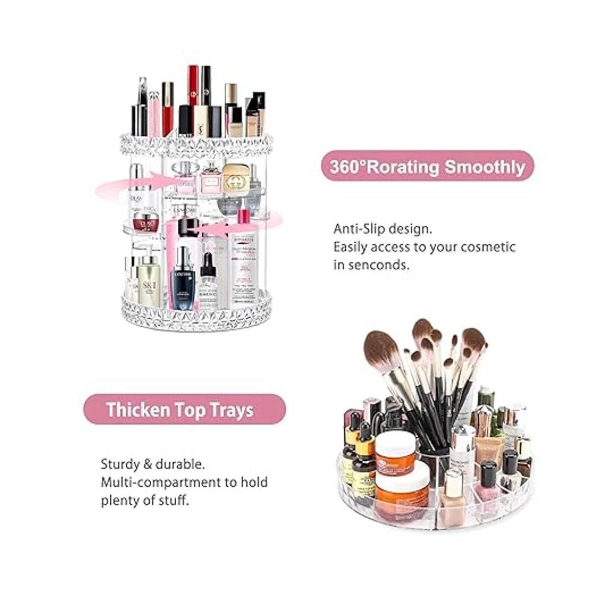 Organizador de maquillaje giratorio de 360 Esta caja organizadora de maquillaje tiene una base giratoria constante que permite girar 360 de forma silenciosa y suave, te permite sacar fácilmente tus cosméticos en cuestión de segundos. Gran organizador de maquillaje para tocador.