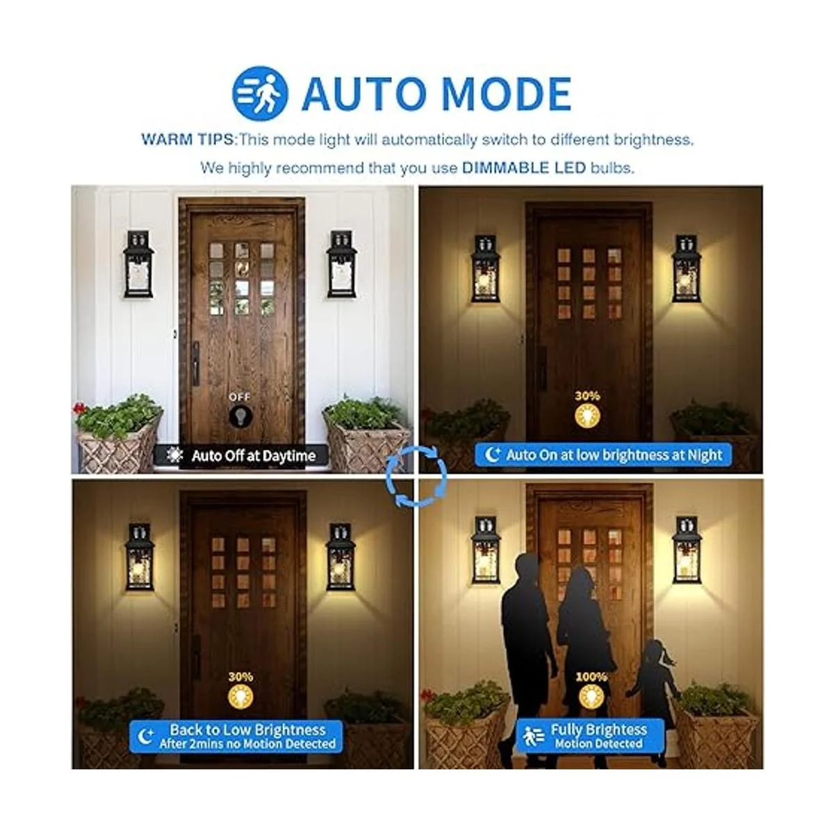 Sensor creativo activado por movimiento y del atardecer al amanecer Nuestra luz frontal de porche integrada con tecnología avanzada Pir y sensores de fotocélula. Se enciende automáticamente al atardecer con un 30 de luz tenue, se activa con 100 de luz alta una vez que se detecta movimiento, se revierte al 30 de brillo después de 2 minutos sin movimiento, y se apaga automáticamente al amanecer. Lo que es más, gama precisa de sensores de movimiento de 40 pies de distancia, 220 grados, libera tus manos con tecnología de sensores inteligentes y ahorra energía de manera efectiva.