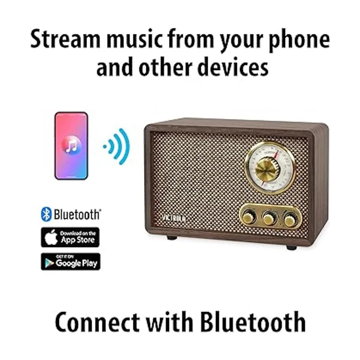 Más que una radio: escucha música a través de AM/FM tradicional y a través de la transmisión inalámbrica Bluetooth con la radio retro de Victrola nogal. Con un aspecto clásico vintage y características modernas, eleva la estética de tu hogar u oficina perfectamente