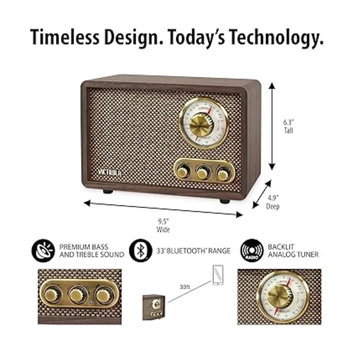 Todos los controles que necesitas: cuenta con una perilla de volumen que se dobla como botón de encendido, un sintonizador AM/FM para navegar a través de estaciones y una perilla de graves y agudos para personalizar tu experiencia auditiva. Los pomos tienen un tacto agradable y un ambiente antiguo moderno