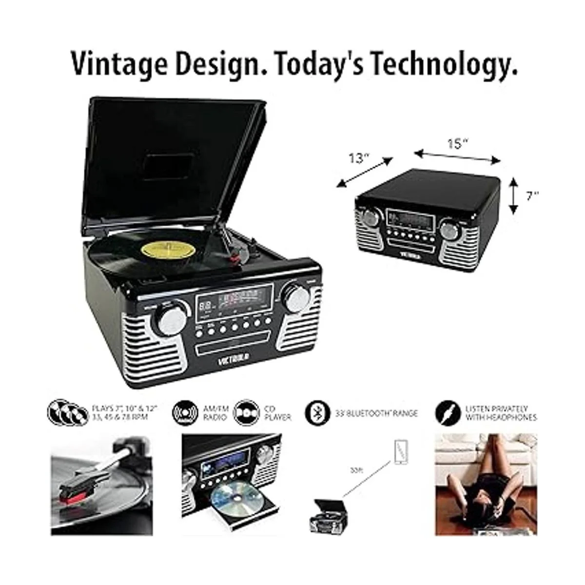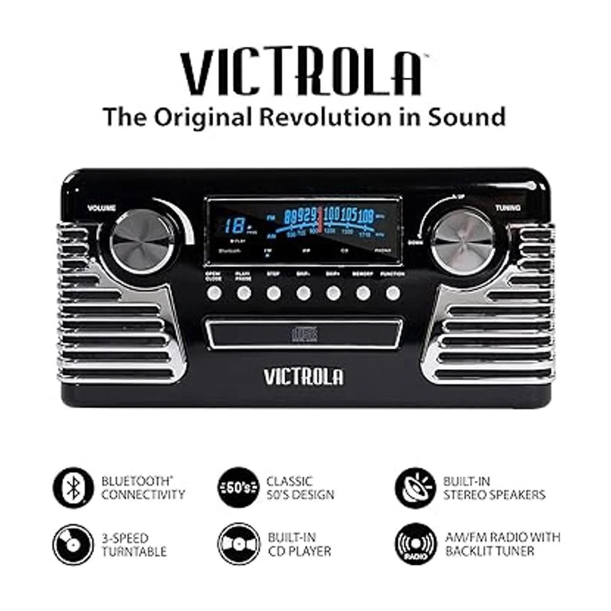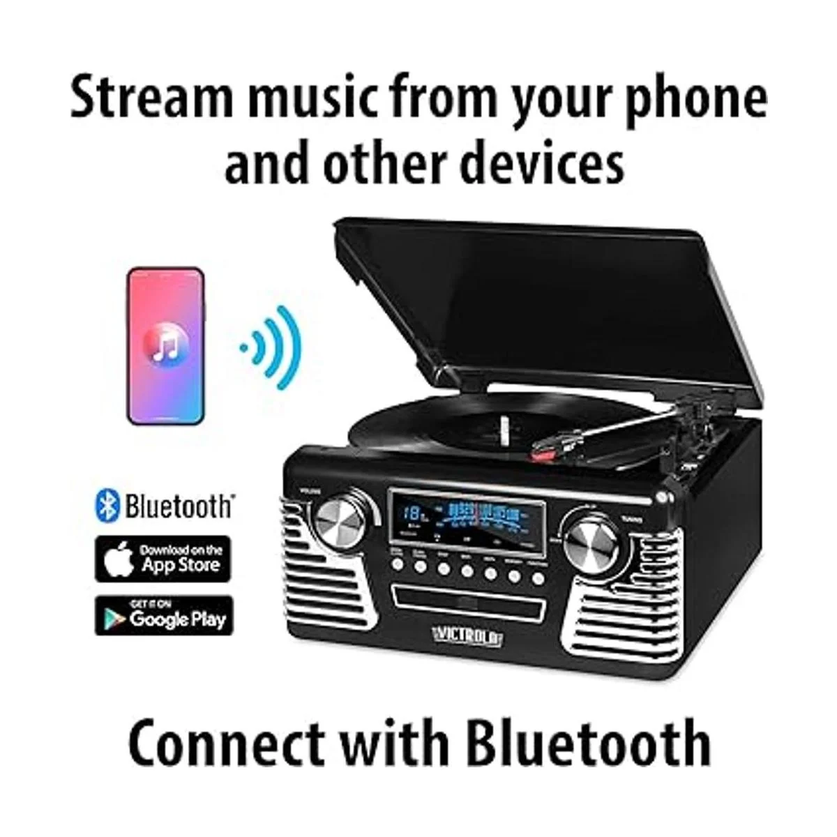 Victrola Reproductor de discos Bluetooth retro de los años 50 y centro multimedia con altavoces integrados, tocadiscos de 3 velocidades, reproductor de CD, radio AMFM Grabación de vinilo a MP3 Transmisión de música inalámbrica Negro