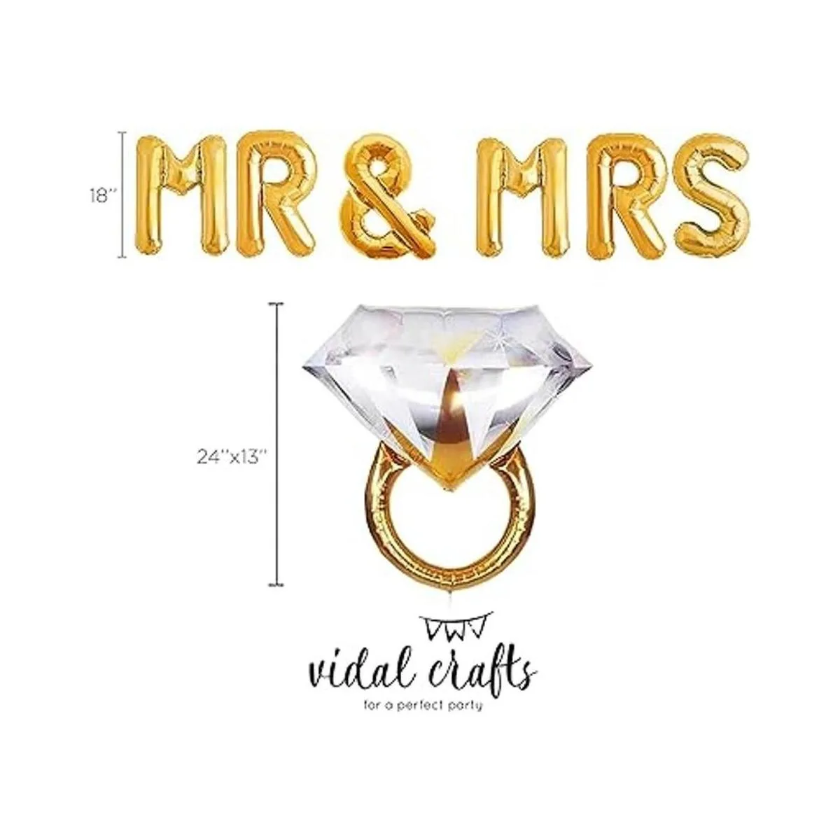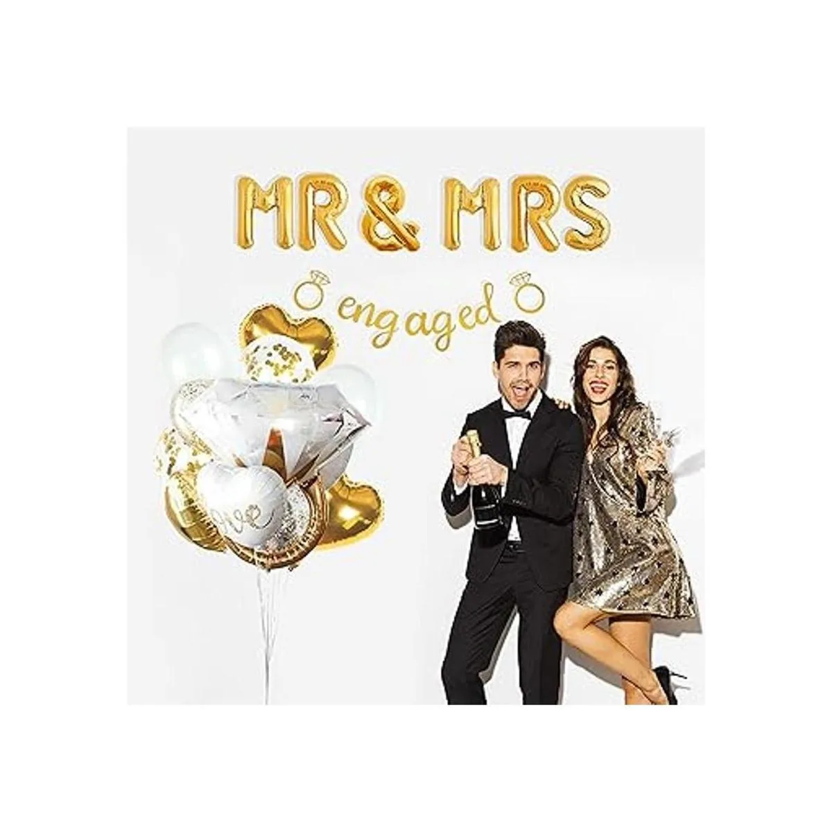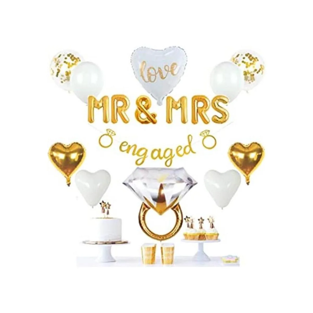 VIDAL CRAFTS Decoraciones de fiesta de compromiso doradas, pancartas comprometidas doradas, globos de señor y señora Sr.; anillo gigante, globos de corazón, globos de confeti de látex dorado, decoración temática dorada y decoración de fiesta de compromiso