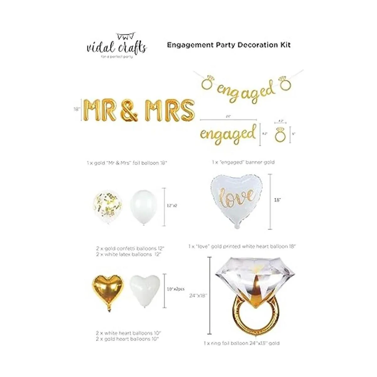 Calidad prémium: el paquete VIDAL CRAFTS está lleno de pancarta de compromiso de alta calidad y decoraciones de globos de compromiso para tu celebración especial; estamos 100 dedicados a la completa satisfacción; nuestra misión es diseñar los artículos de fiesta para tus ideas de fiesta