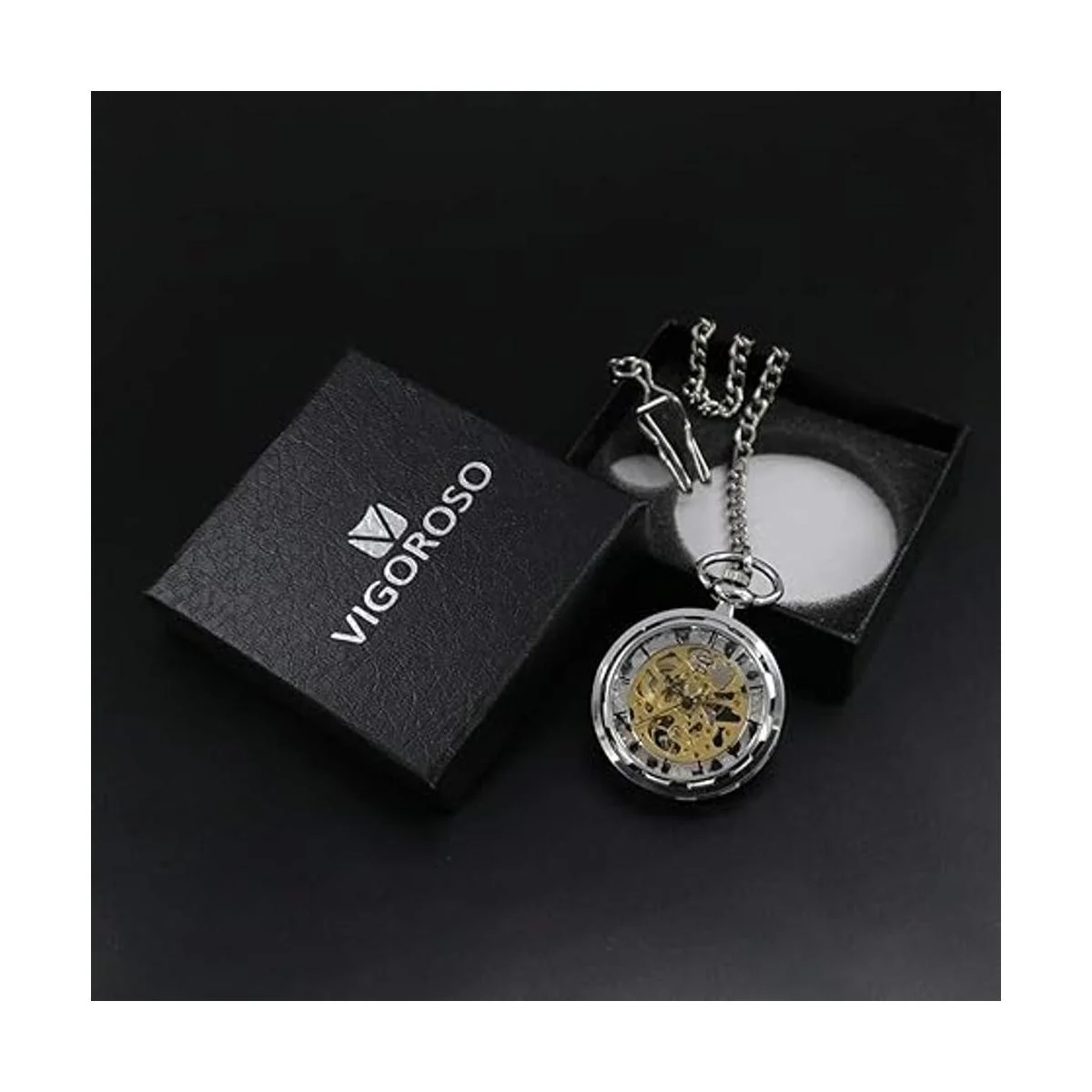 VIGOROSO Reloj de bolsillo clásico steampunk para hombre, reloj mecánico de esqueleto dorado, reloj en caja, Oro, Mecánico