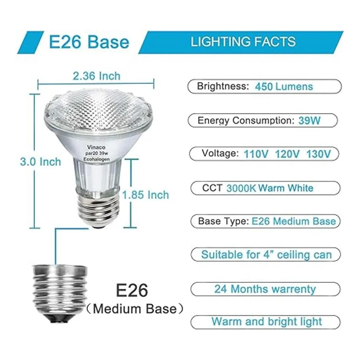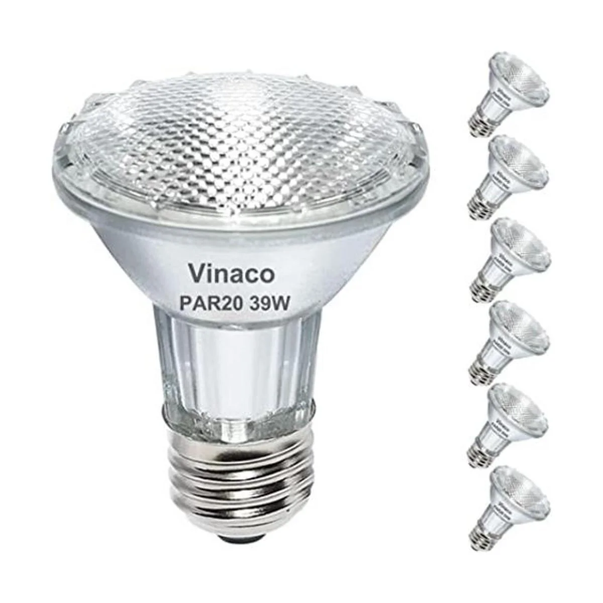 Vinaco PAR20 Bombillas halógenas, 6 bombillas halógenas PAR20 de 39 W, regulables, 3000 K, blanco cálido, alto brillo PAR20 de inundación 39 W, 120 V, 480 lúmenes, equivalente a PAR20 50 W, 120 V, base media PAR20 E26 para luces de pista