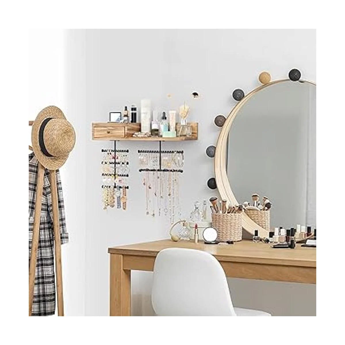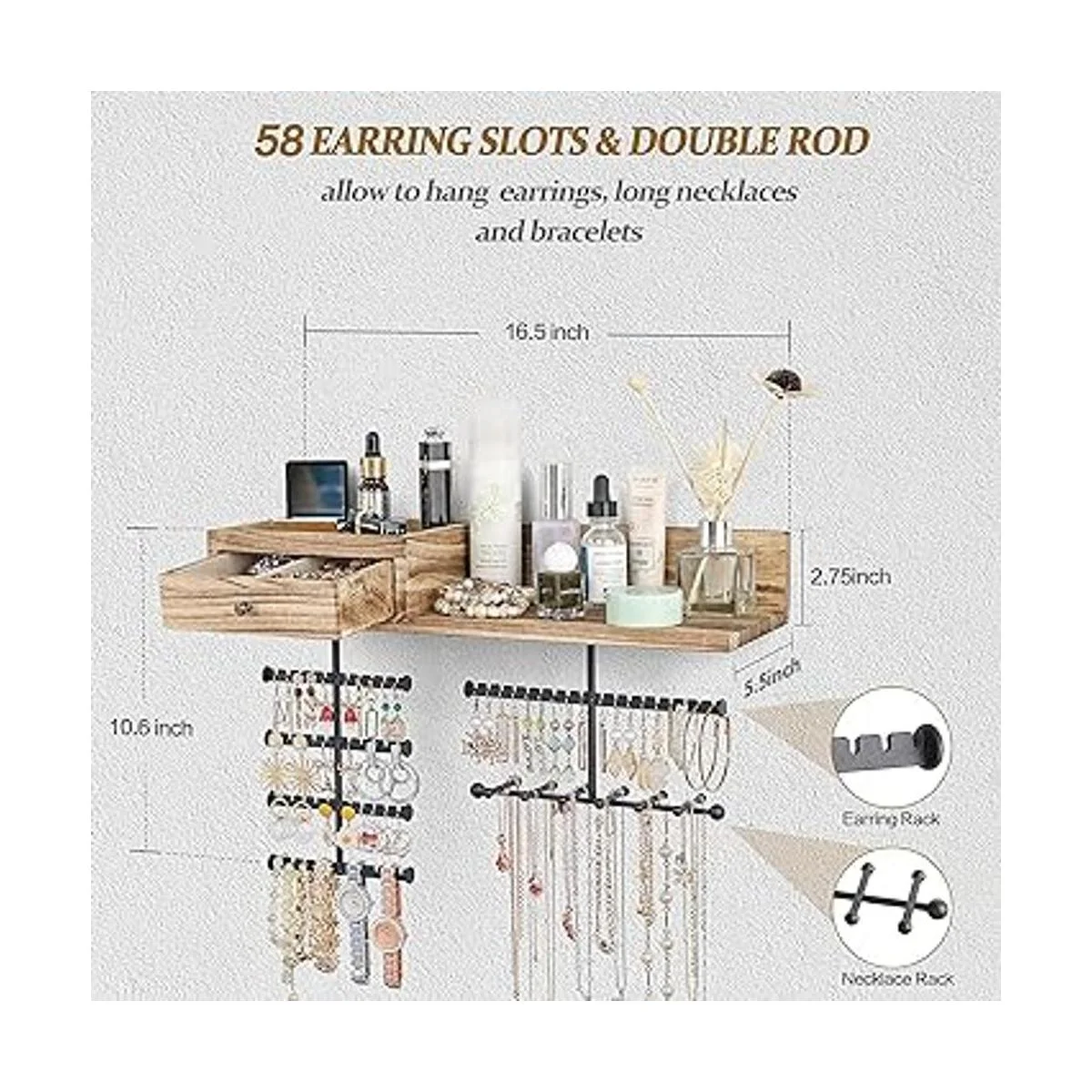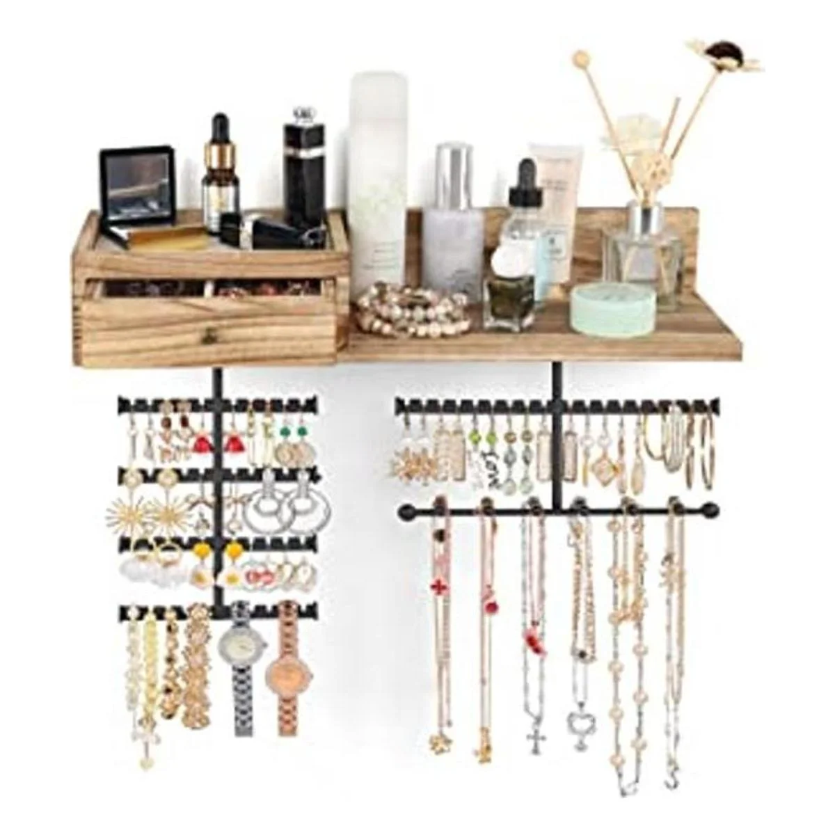 VINAEMO Organizador de joyas para colgar en la pared con cajón de madera rústica y estante de almacenamiento de gran capacidad para aretes, anillos, collares, pulseras