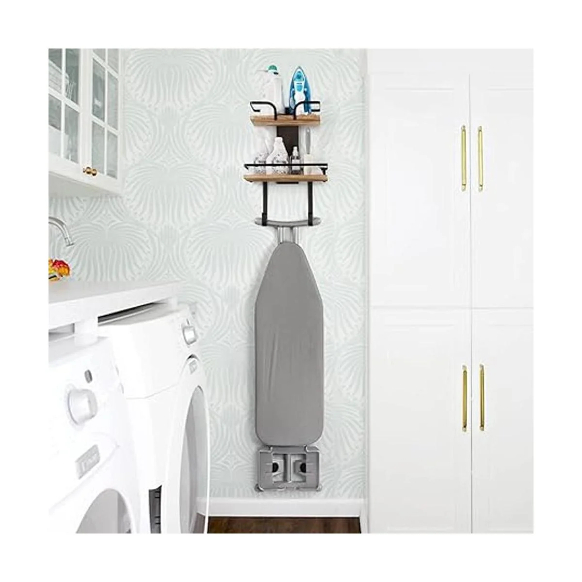 VINAEMO Soporte de pared para tabla de planchar, soporte de pared de 2 capas para plancha y tabla de planchar, estantes de lavandería de madera maciza con ganchos extraíbles, organización y almacenamiento del hogar