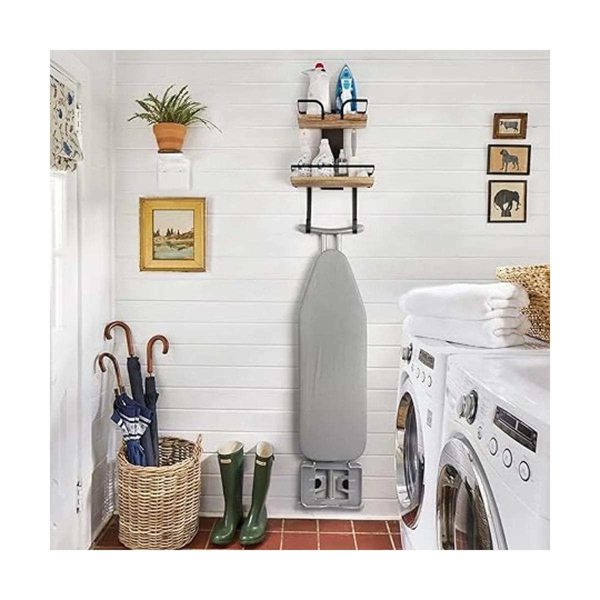 Imprescindible para la lavandería: la construcción sin costuras de madera rústica natural y metal es estéticamente agradable y duradera, sirve como un refugio seguro para tu tabla de planchar y planchas. No hay más quejas sobre la tabla de planchar que estropee la decoración de tu casa.