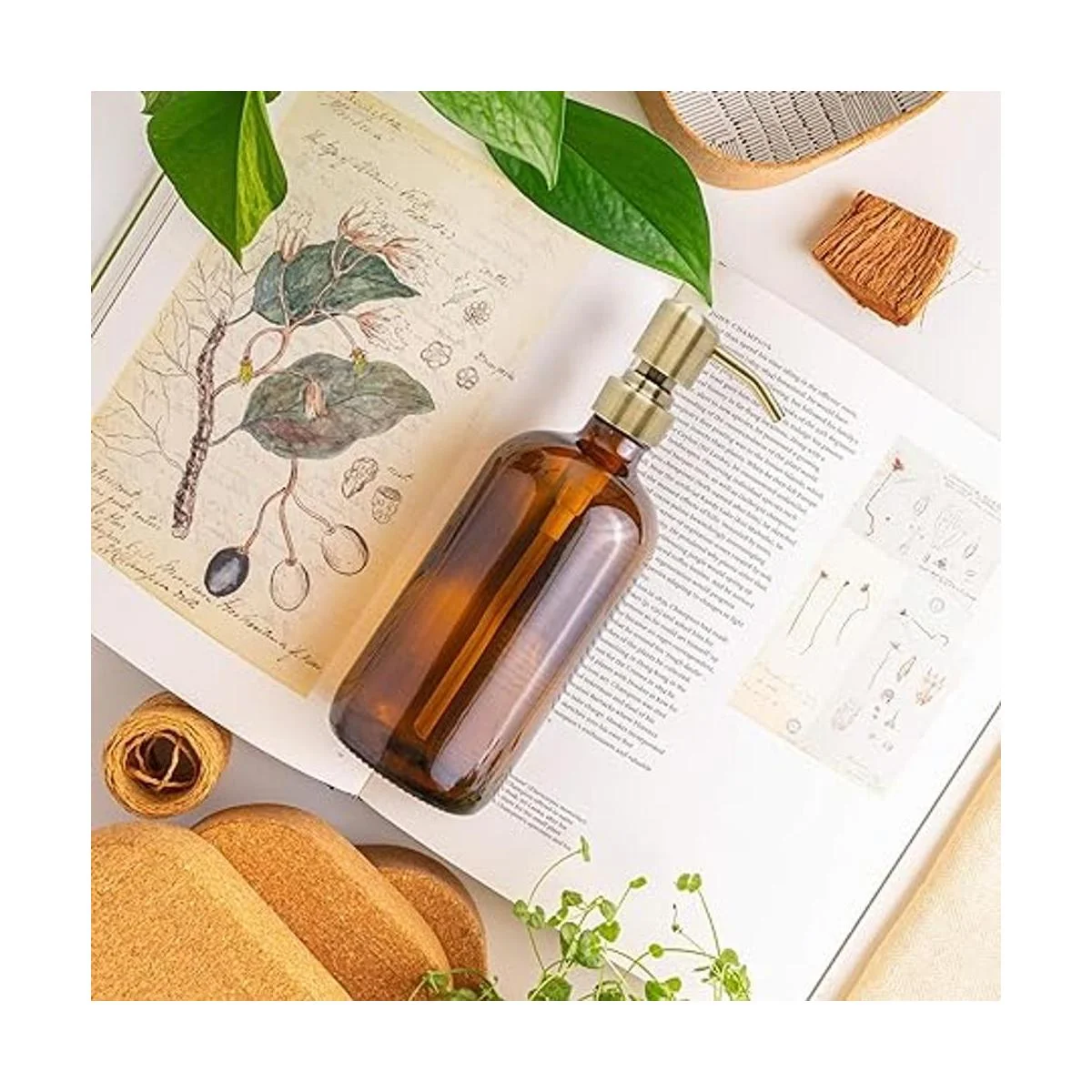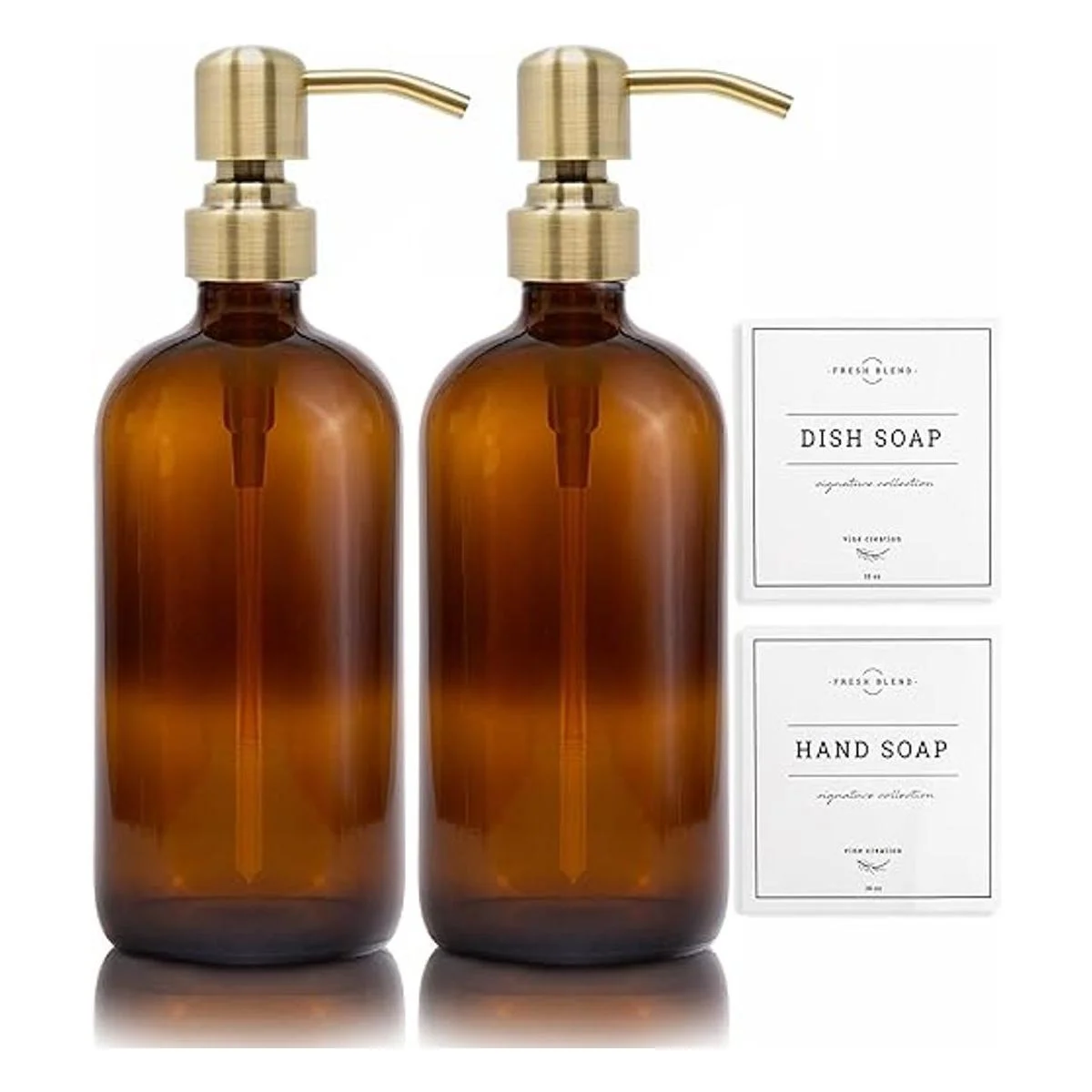 Vine Creations Dispensador de jabón de vidrio ámbar, 2 unidades, botellas gruesas de 16 oz, bomba de acero inoxidable, jarra vintage para una moderna casa de campo, accesorios para el baño o la cocina, con etiquetas impermeables (oro cepillado)