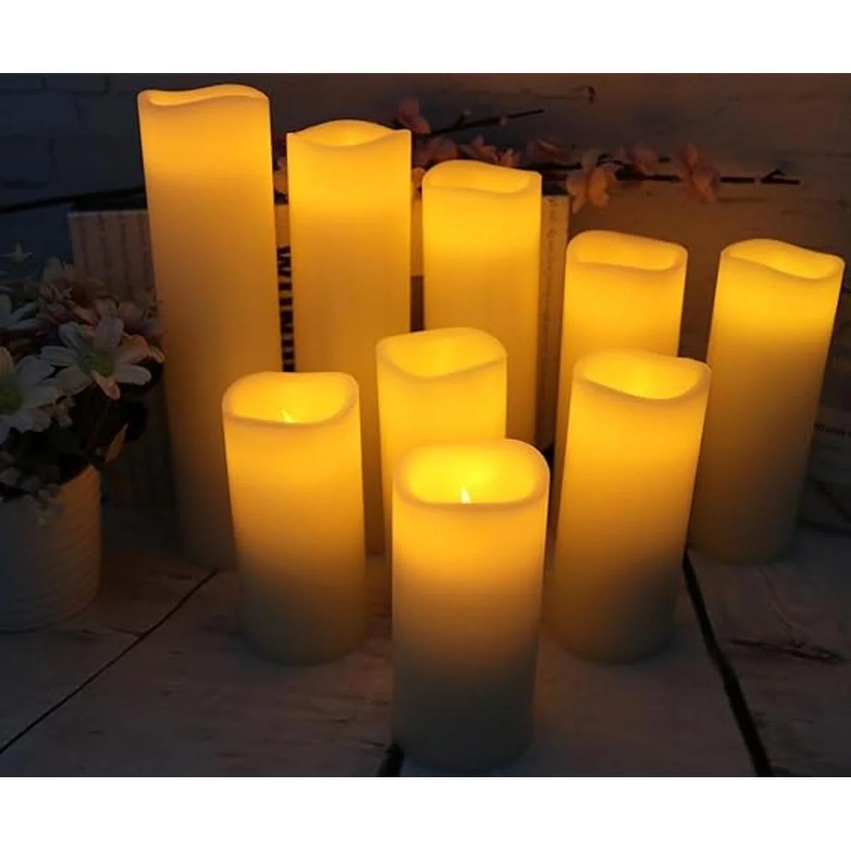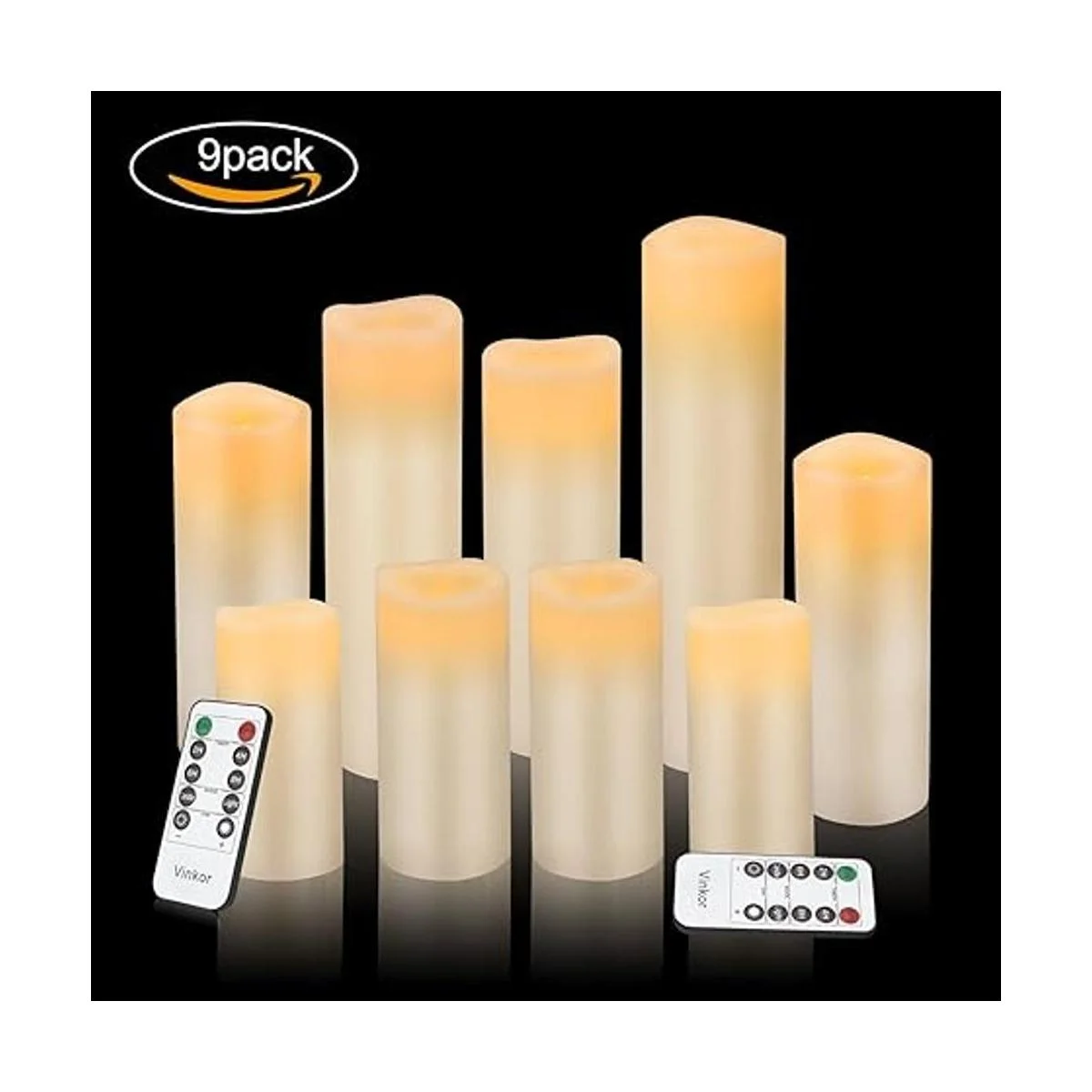 Vinkor Velas sin llama, velas a pilas, de 4 pulgadas, 5 pulgadas, 6 pulgadas, 7 pulgadas, 8 pulgadas, 9 pulgadas, juego de 9 velas LED de cera real marfil con control remoto de 10 teclas y temporizador de 24 horas