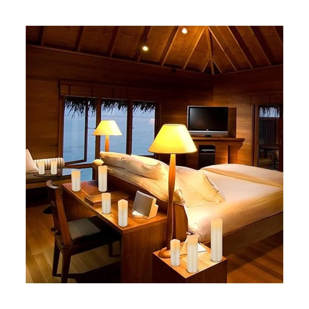 Ahorro de energía, potentes LED: este paquete incluye dos pilares de 4 pulgadas, dos pilares de 5 pulgadas, dos pilares de 6 pulgadas, un pilar de 7 pulgadas, un pilar de 8 pulgadas, un pilar de 9 pulgadas cada vela de 2.2 pulgadas de diámetro, 2 controles remotos. 1 manual idioma español no garantizado. Esta vela sin llama funciona con 2 pilas AA no incluidas