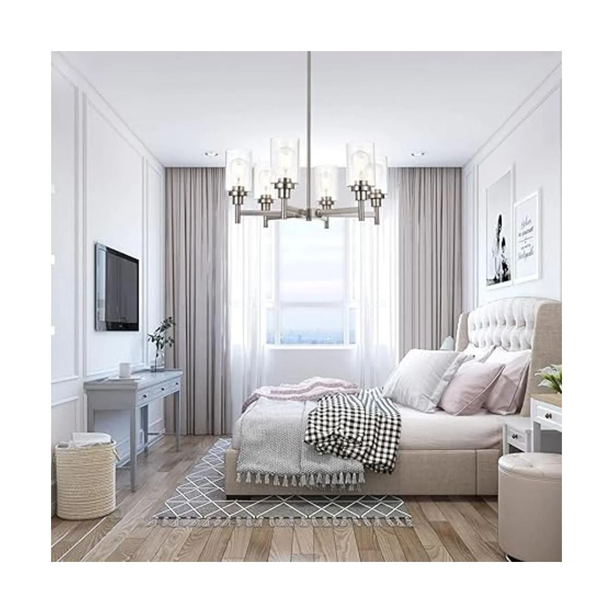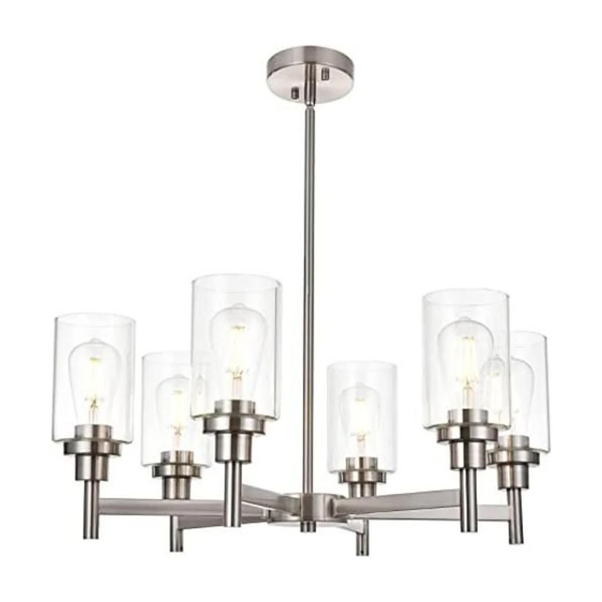 VINLUZ Lámpara de araña contemporánea de 6 luces de níquel cepillado moderno, cilindro de iluminación colgante de cristal transparente, lámparas de techo clásicas para sala de estar, comedor y cocina